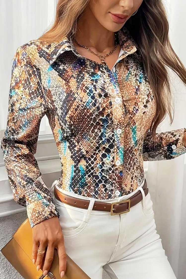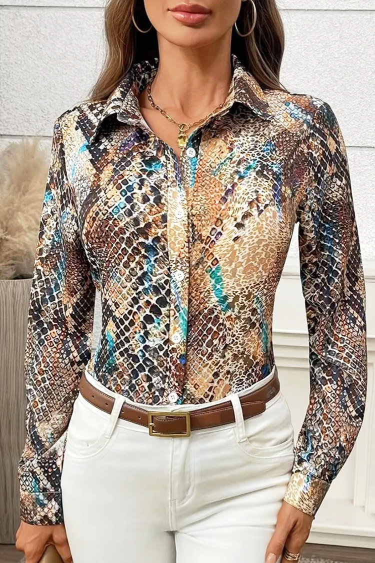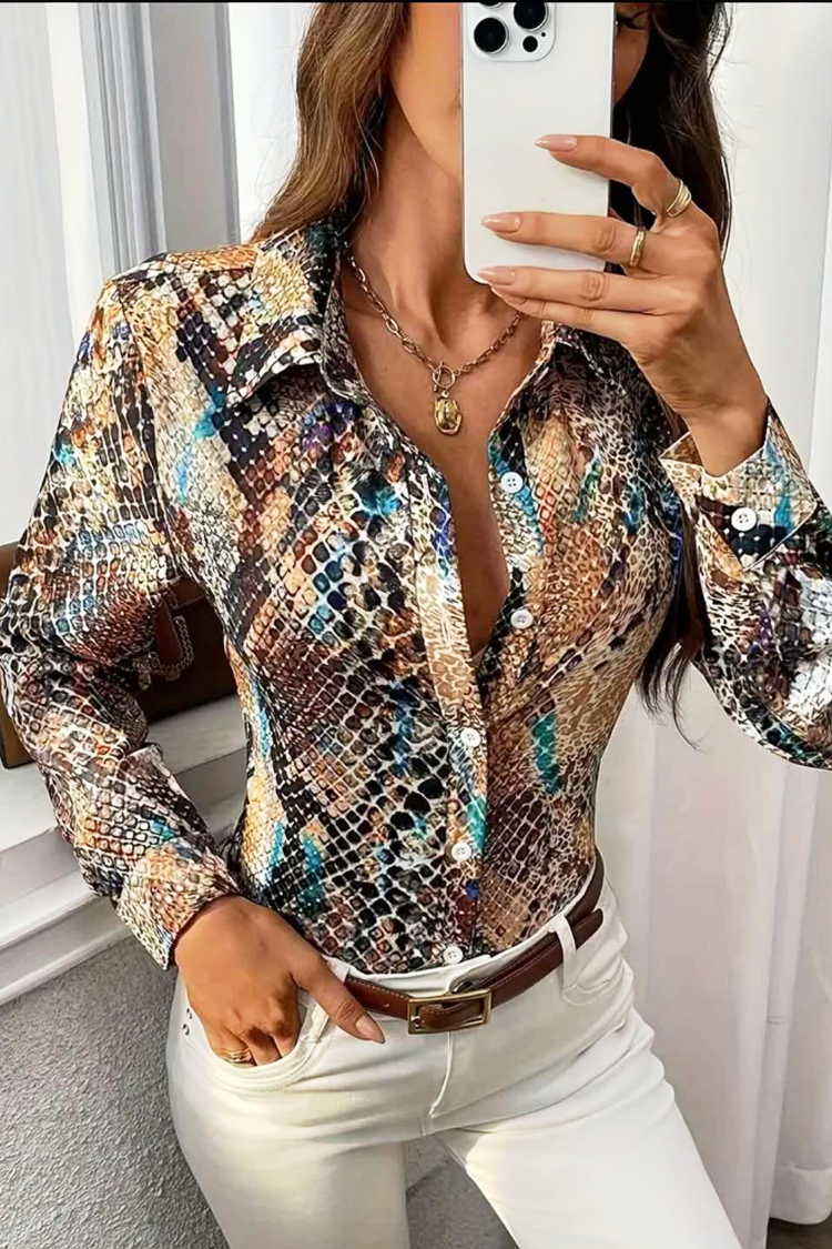 - Cămașa are mâneci lungi și închidere standard cu nasturi pe lungime, guler cu rever și un model multicolor.