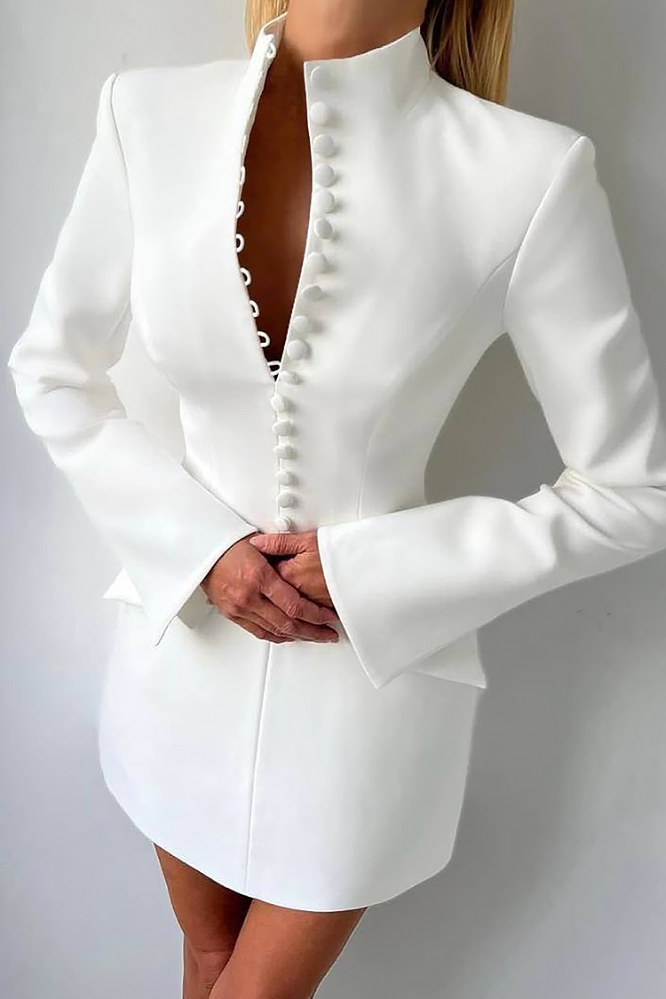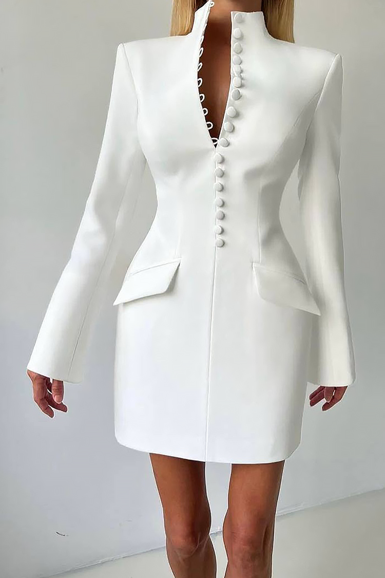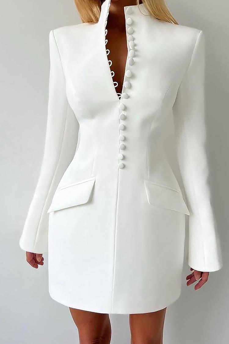 - Rochia are o croială elegantă de tip blazer, închidere cu nasturi, mâneci lungi și buzunare elegante.