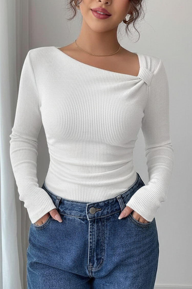 - Modelul are mâneci lungi, o croială mulată, un model monocromatic și un decolteu asimetric.