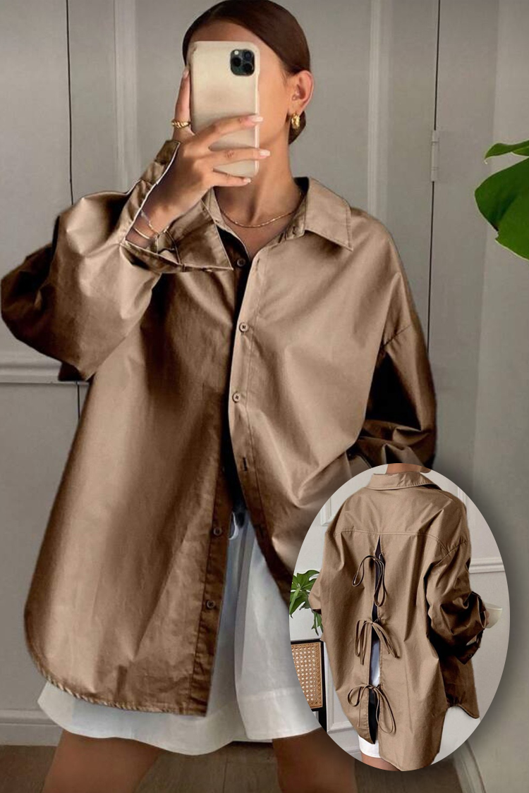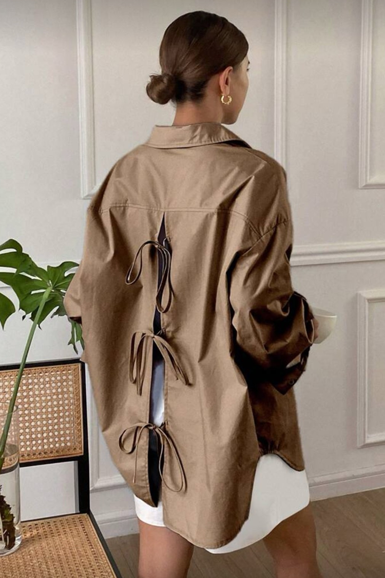 - Modelul are mâneci lungi, o croială oversize se închide cu nasturi în față și un spate spectaculos cu panglici decorative.
