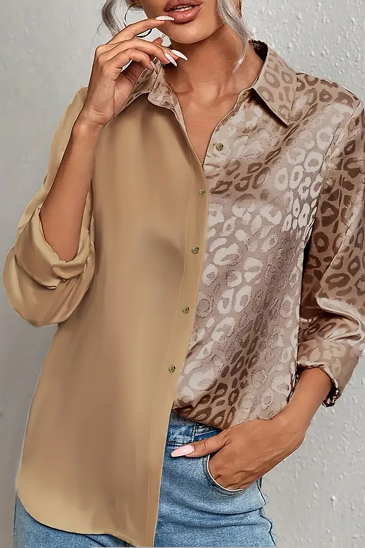 - Modelul are mâneci lungi, o croială elegantă, guler cu rever, nasturi și un model leopard contrastant.