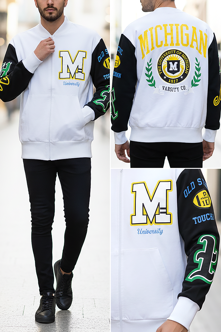 - Hanorac pentru bărbați modern, cu buzunare albe și un imprimeu spectaculos pe mâneci și spate, potrivit pentru viața de zi cu zi, sport sau plimbări.