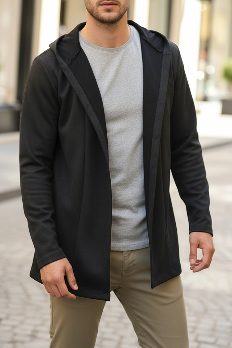 - Un cardigan modern și funcțional pentru bărbați, fără nasturi, de culoarea clasică neagră, potrivit pentru viata de zi cu zi.