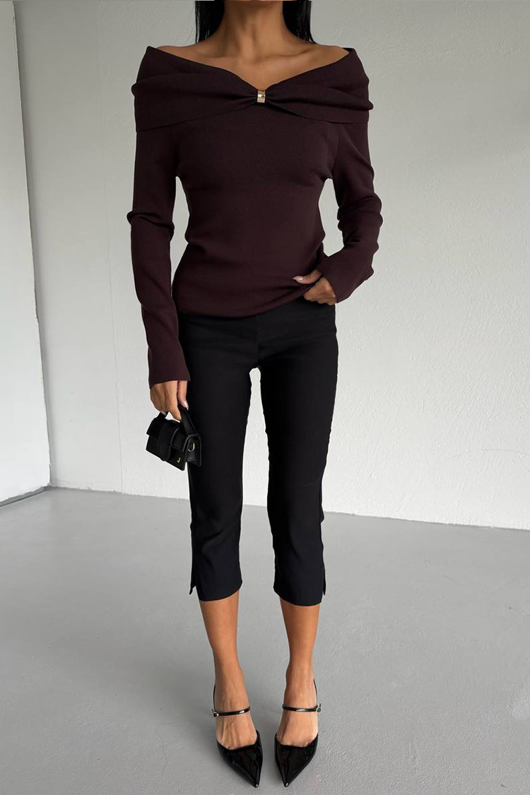 - Modelul are mâneci lungi, o croială mulată, un model monocromatic și un design atractiv cu detaliu metalic în față.