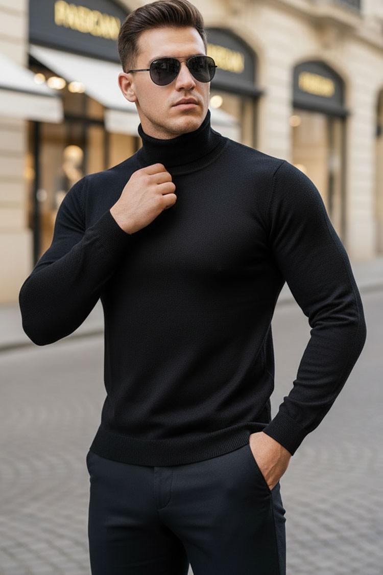 - Pulover elegant pentru bărbăti cu guler de tip polo și croială mulată, de culoare neagra.