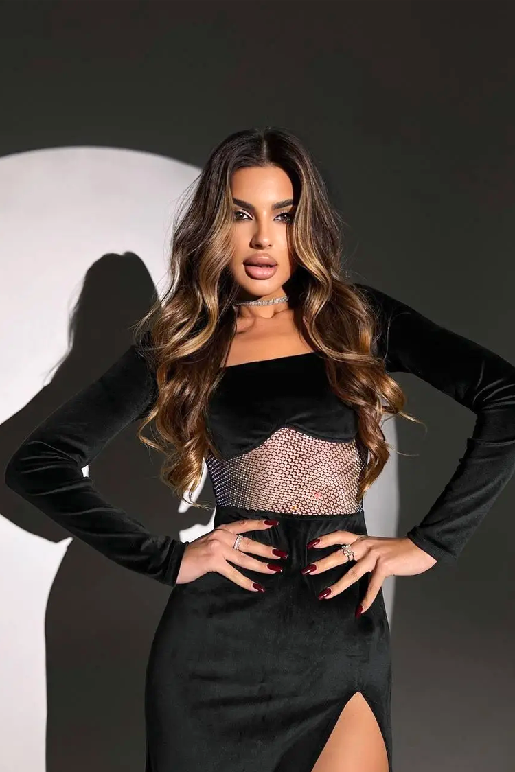 - Modelul are lungime midi, culoare neagră, efect de catifea, croială mulată și crăpătură laterală înaltă.