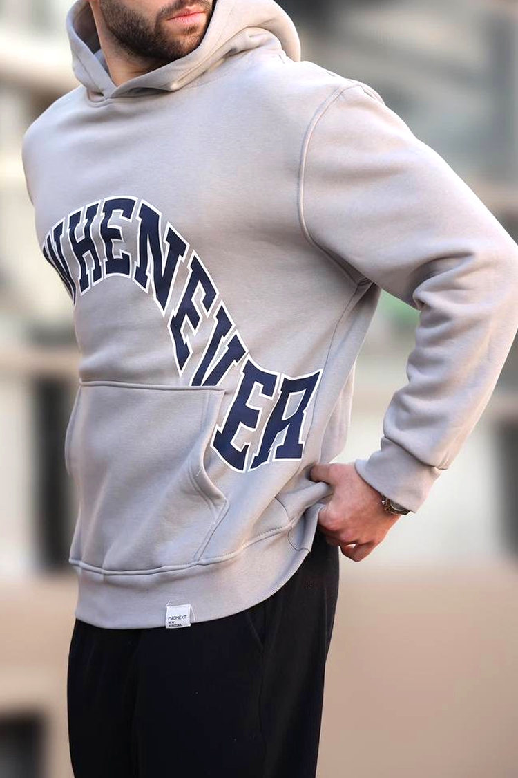 - Hanorac practic pentru bărbați, de culoare gri, cu o inscripție distinctivă, contrastantă, potrivit pentru viața de zi cu zi sau pentru o plimbare.