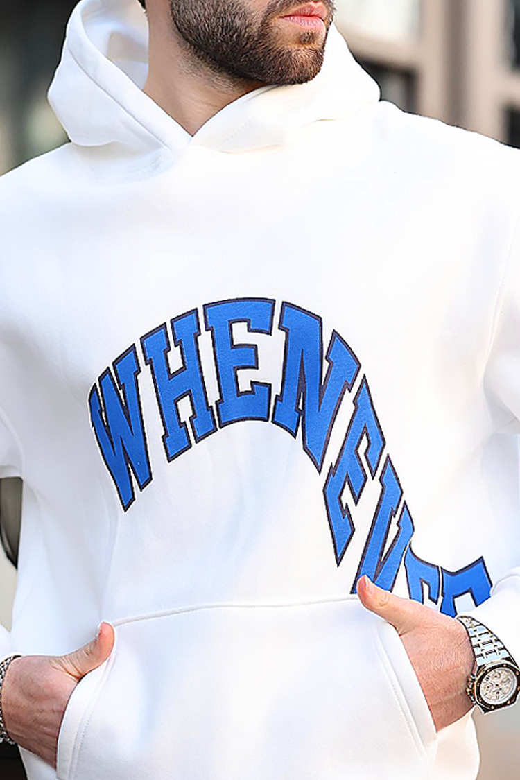 - Hanorac practic pentru bărbați, de culoare alba, cu o inscripție distinctivă, contrastantă, potrivit pentru viața de zi cu zi sau pentru o plimbare.