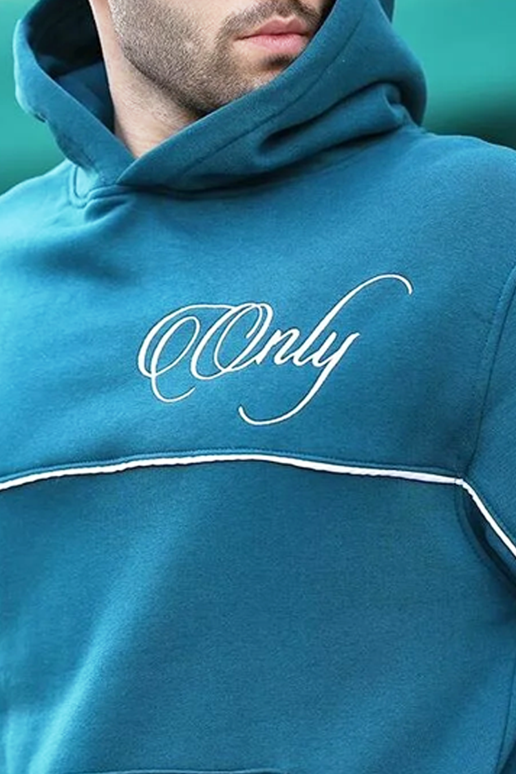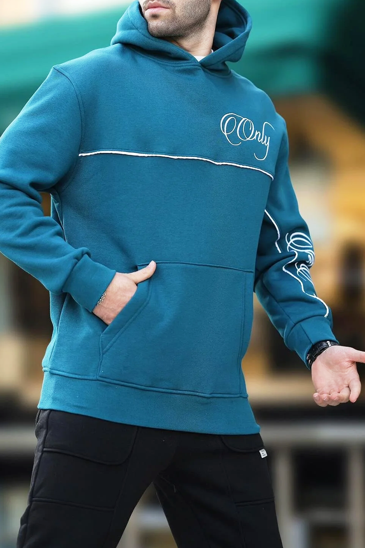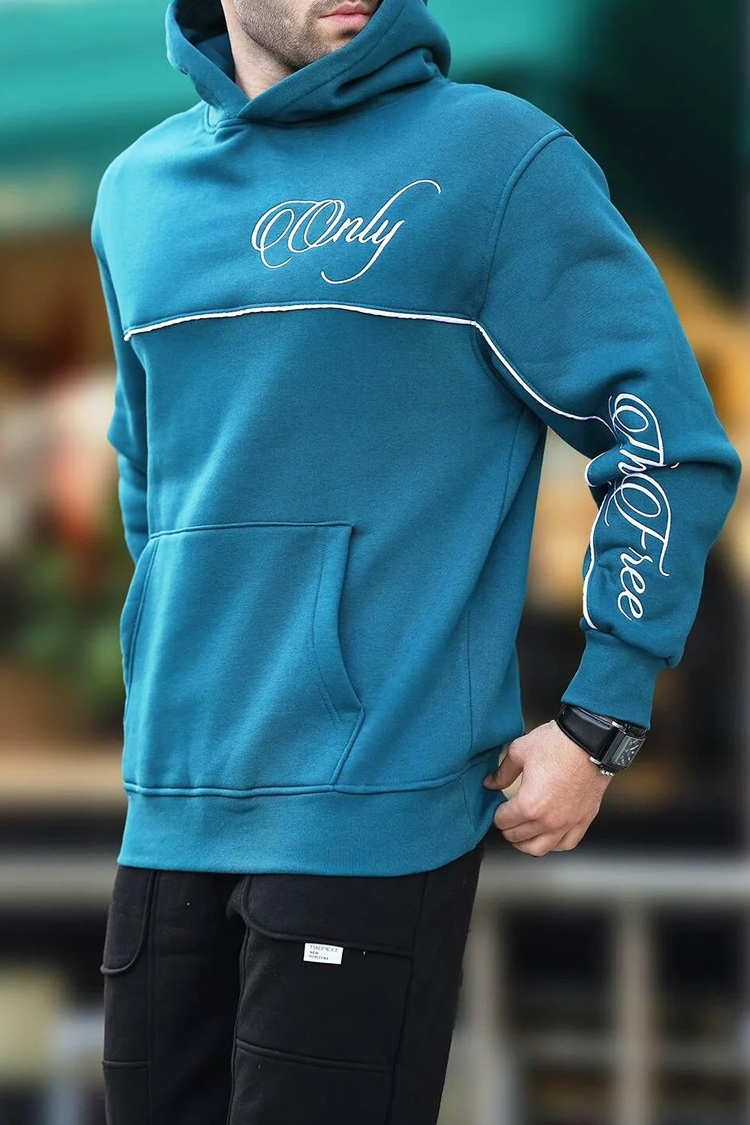 - Hanorac practic pentru bărbați, de culoare verde petrol, cu o inscripție distinctivă, contrastantă, potrivit pentru viața de zi cu zi sau pentru o plimbare.