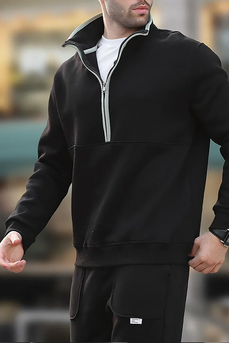 - Hanorac pentru bărbăti cu guler înalt și fermoar, de culoare negru cu design elegant.
