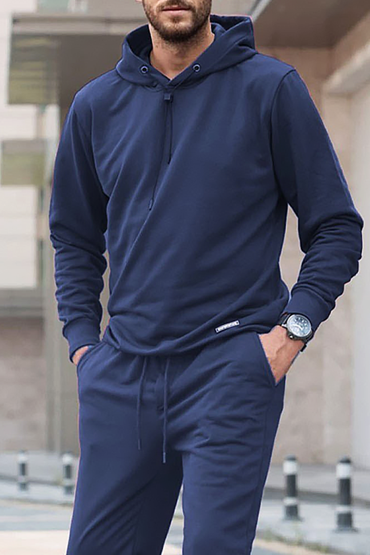 - Set sportiv din două piese pentru bărbați, format dintr-un hanorac cu glugă și pantaloni de culoare albastru închis.