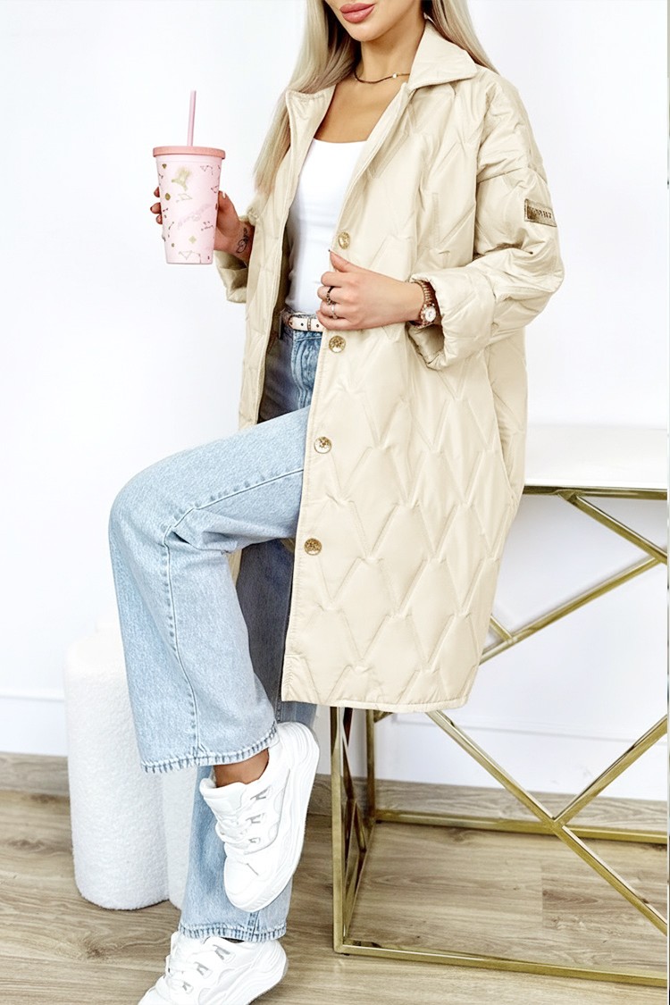 - Modelul are o croială lejeră, potrivită pentru orice siluetă, și se închide cu nasturi pe lungime.