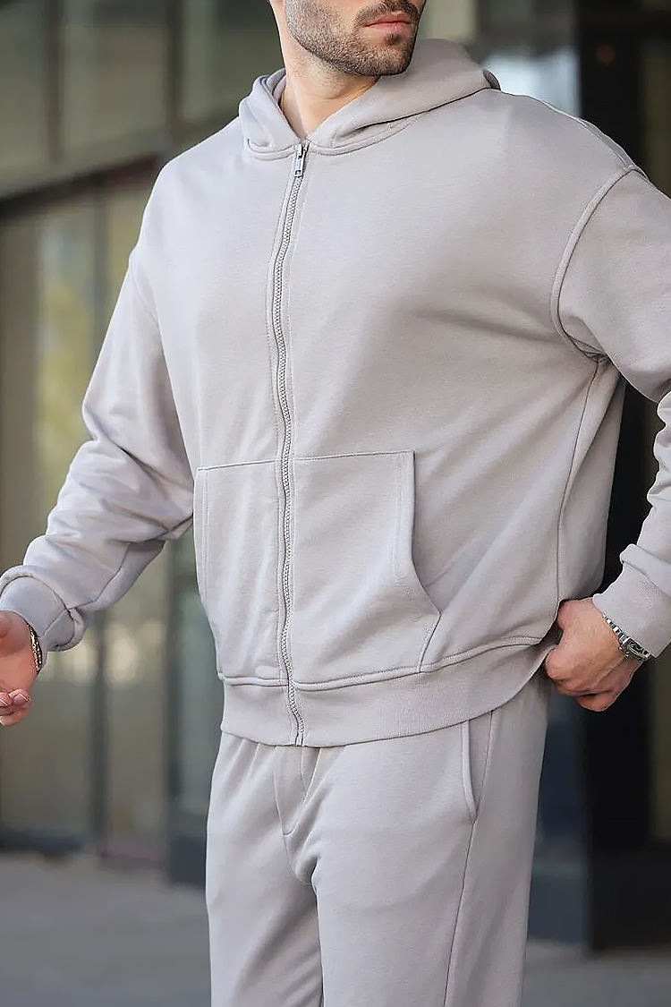 - Set sportiv din două piese pentru bărbați, format dintr-un hanorac cu glugă și pantaloni de culoare gri.