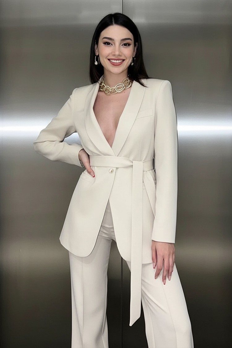 - Pantalonii au talie înaltă, o croială elegantă și picioare late.