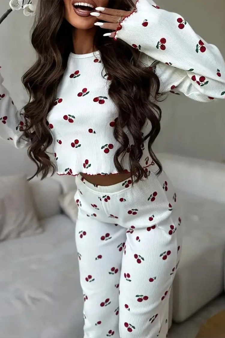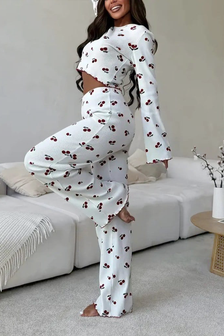- Partea de sus este o bluză cu mâneci lungi, iar pantalonii au talie înaltă și croiala lejera.