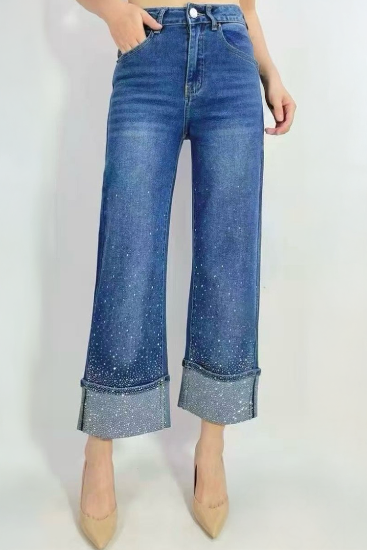 - Modelul are talie înaltă, picioare late și rulate, și pietre decorative.