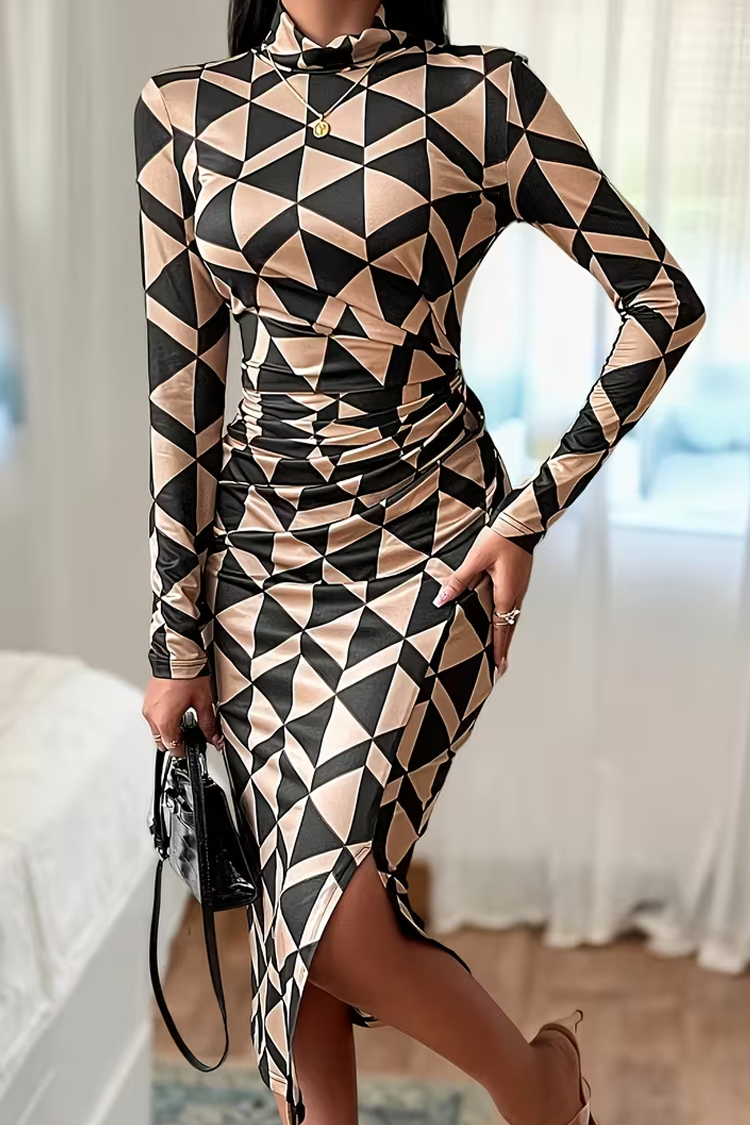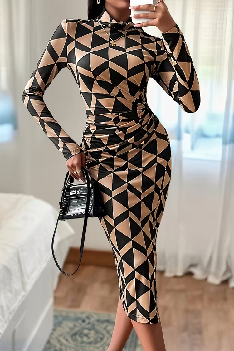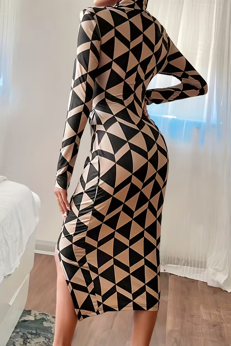 - Pentru un look elegant, alege această rochie midi cu model în două tonuri.