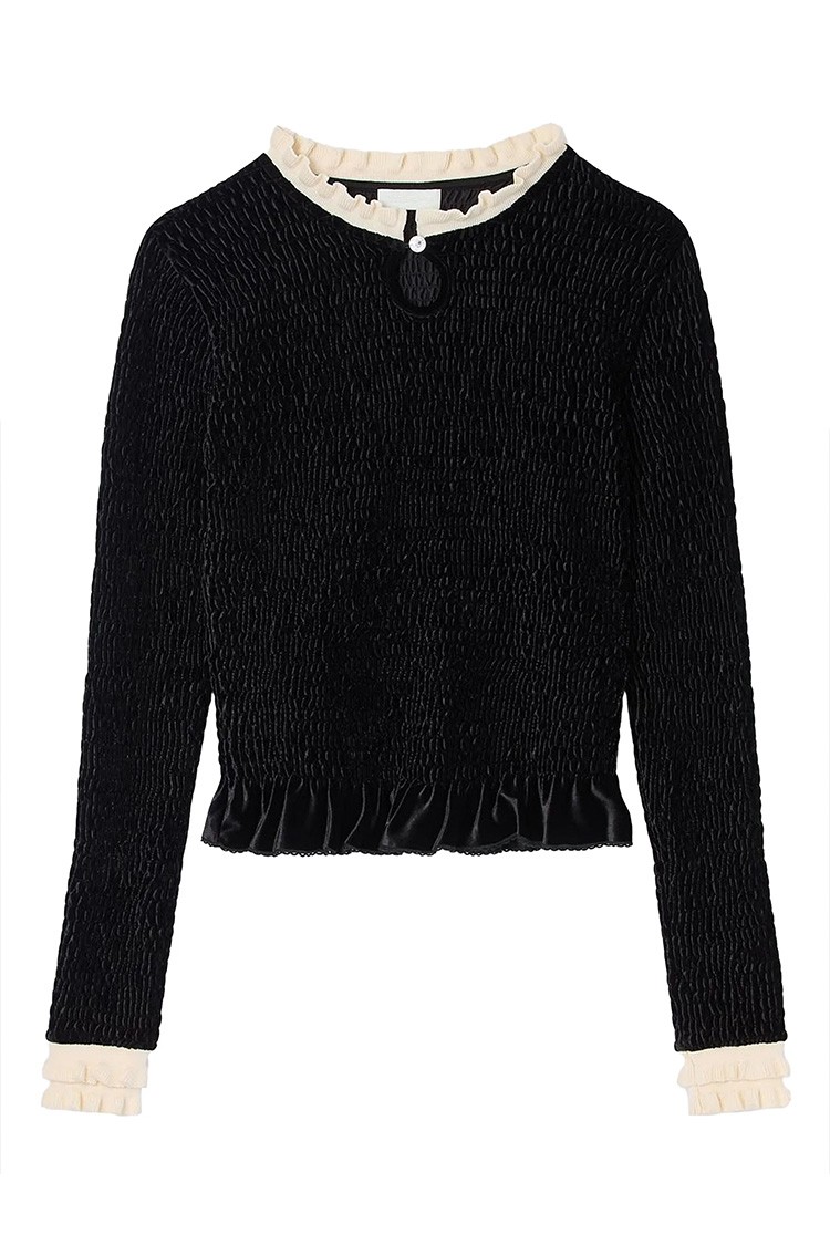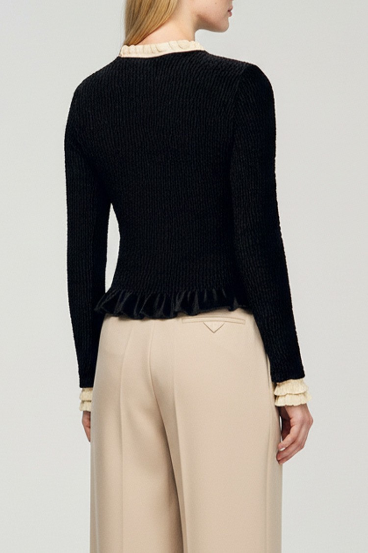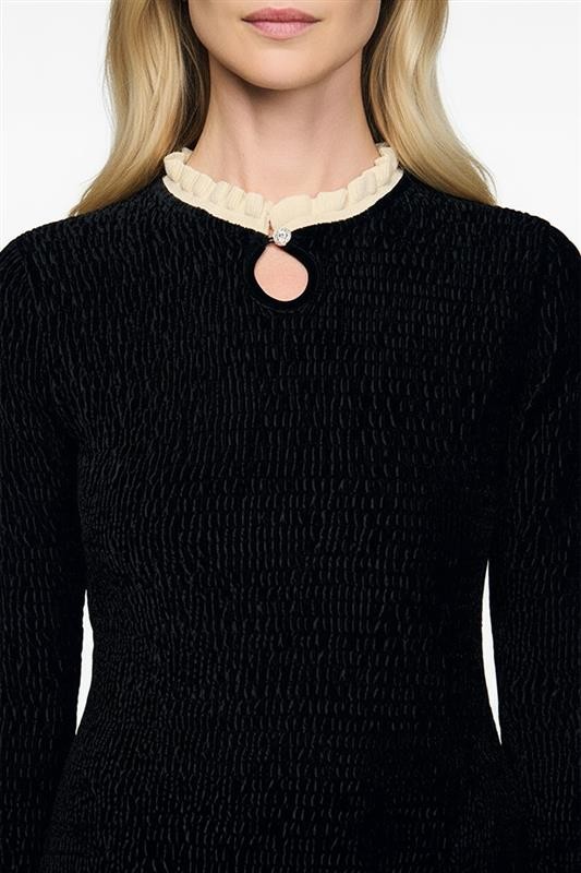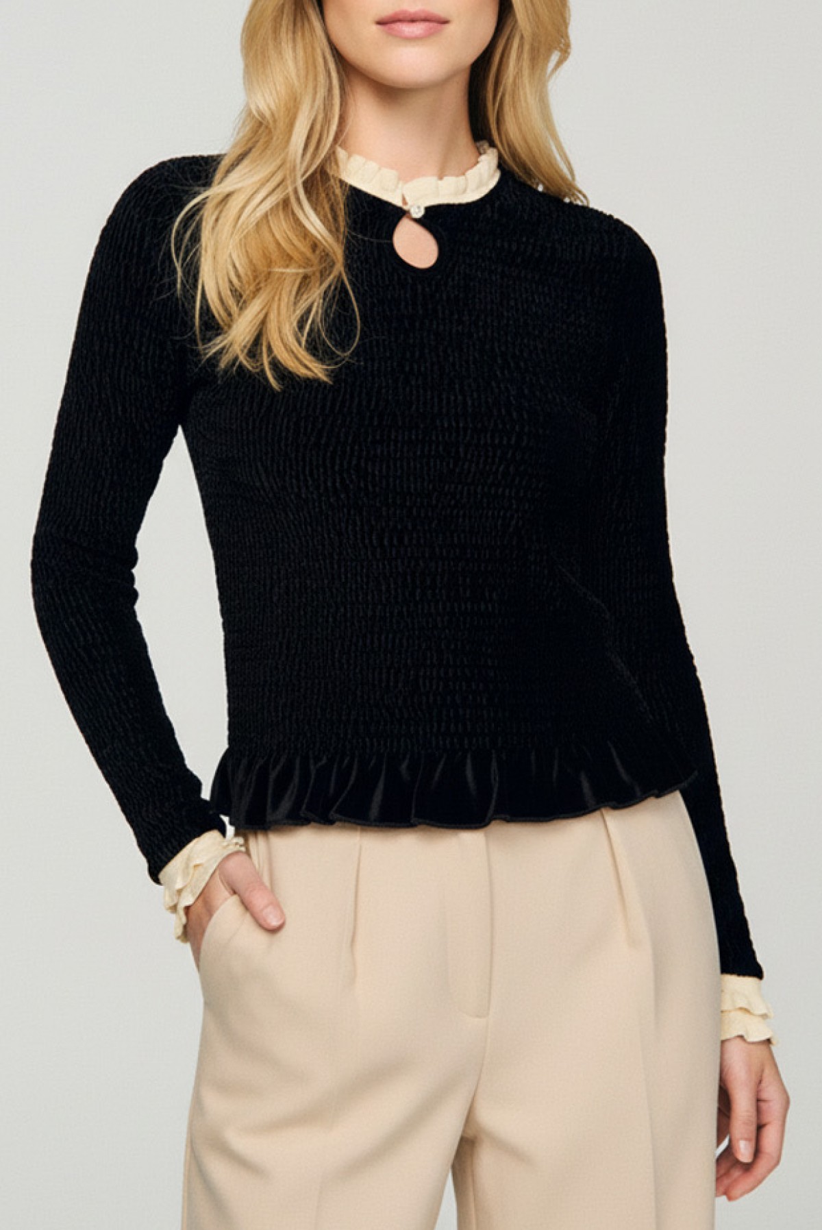 - Modelul are o textură delicată, o deschidere decorativă la decolteu și volane elegante la guler.