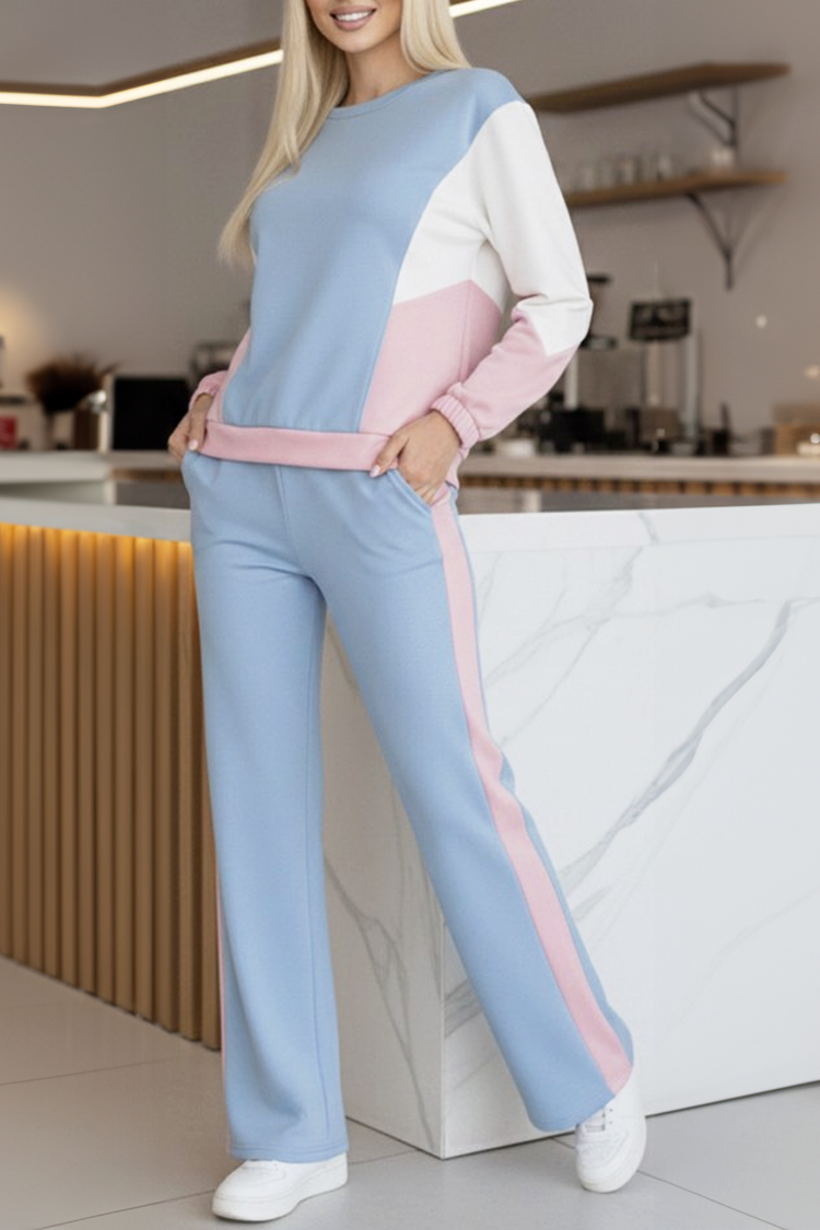 - Bluza are decolteu rotund și o croială confortabilă, iar pantalonul are talie înaltă și picioare lungi.