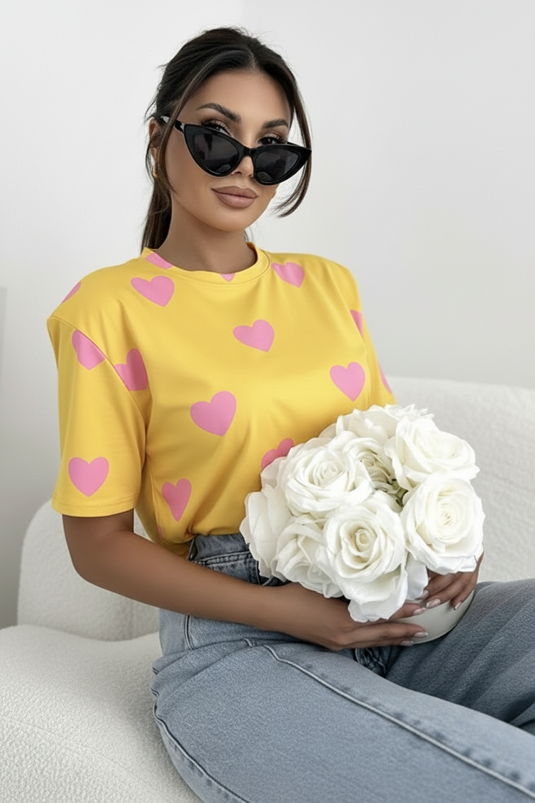 - Modelul are mâneci scurte, decolteu rotund, o croială precisă și un model cu inimioare.