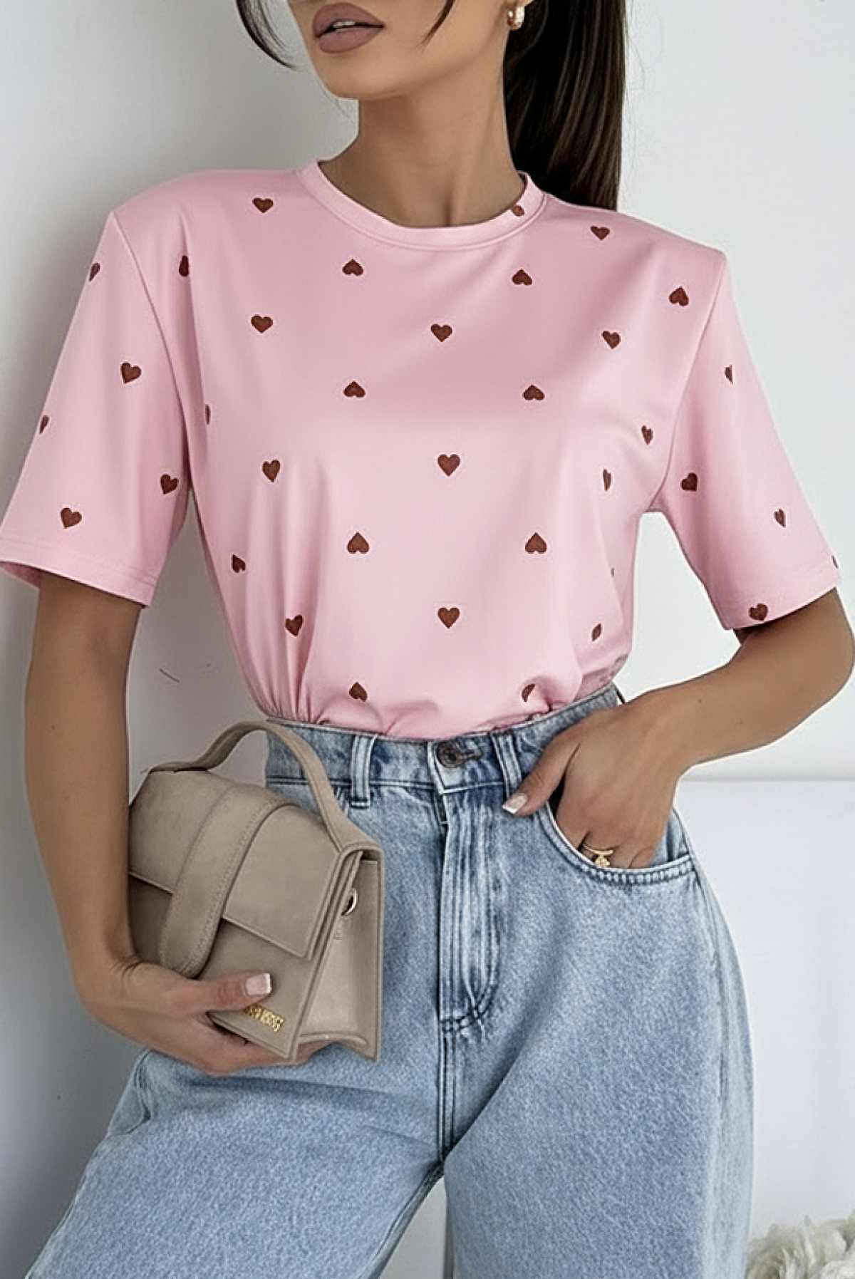 - Modelul are mâneci scurte, decolteu rotund, o croială precisă și un model cu inimioare.