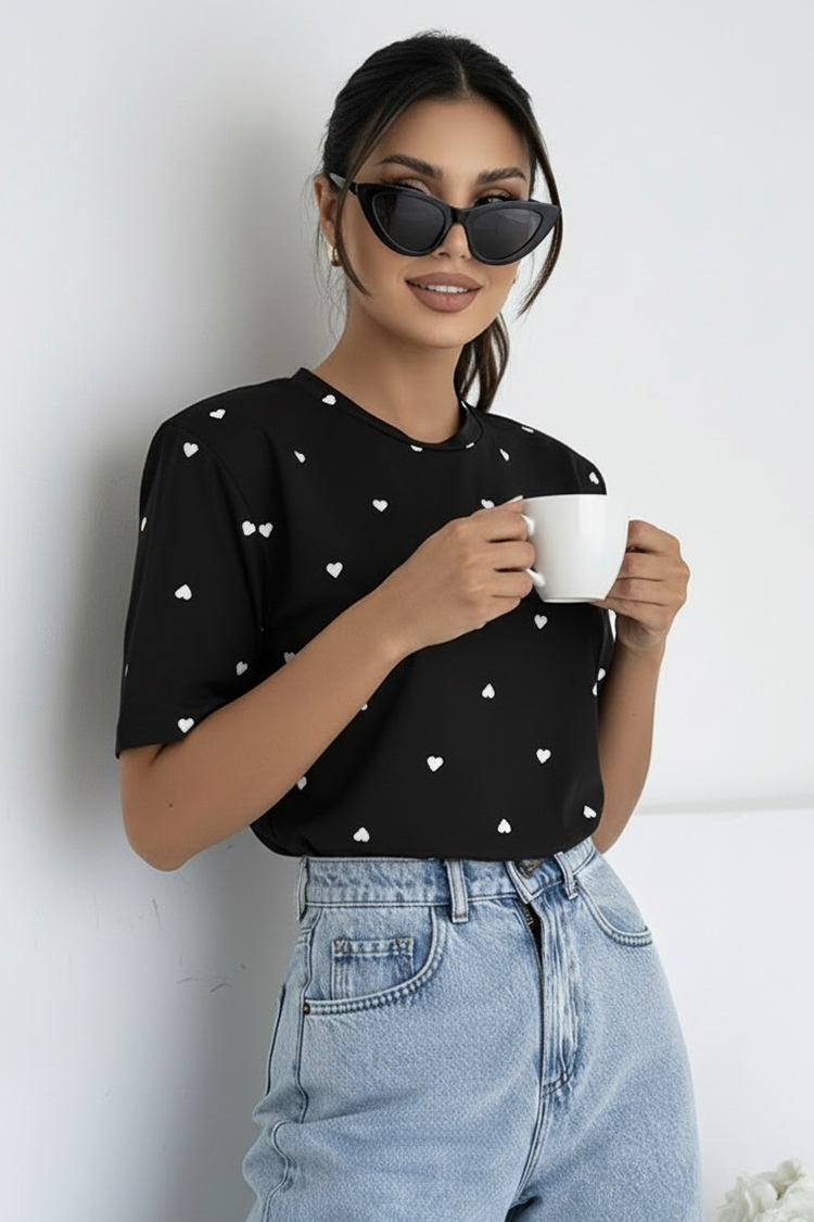 - Modelul are mâneci scurte, decolteu rotund, o croială precisă și un model cu inimioare.