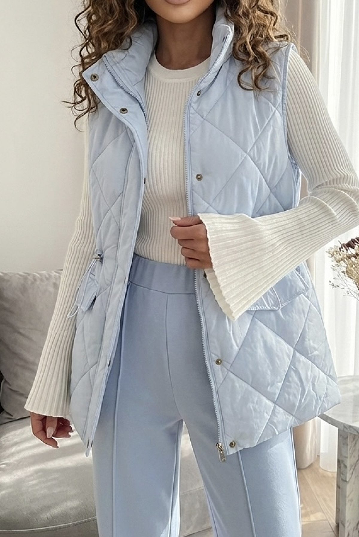 - Vesta are o croială clasică, guler, buzunare și design matlasat.