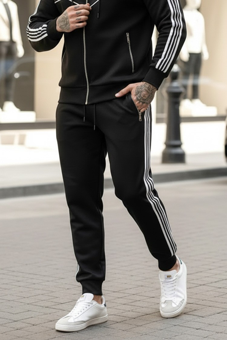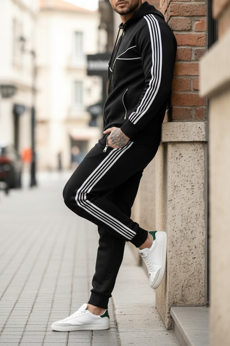 - Set pentru bărbăti confortabil, din două piese, de culoare neagră, cu linii decorative contrastante, format dintr-un hanorac și pantaloni.