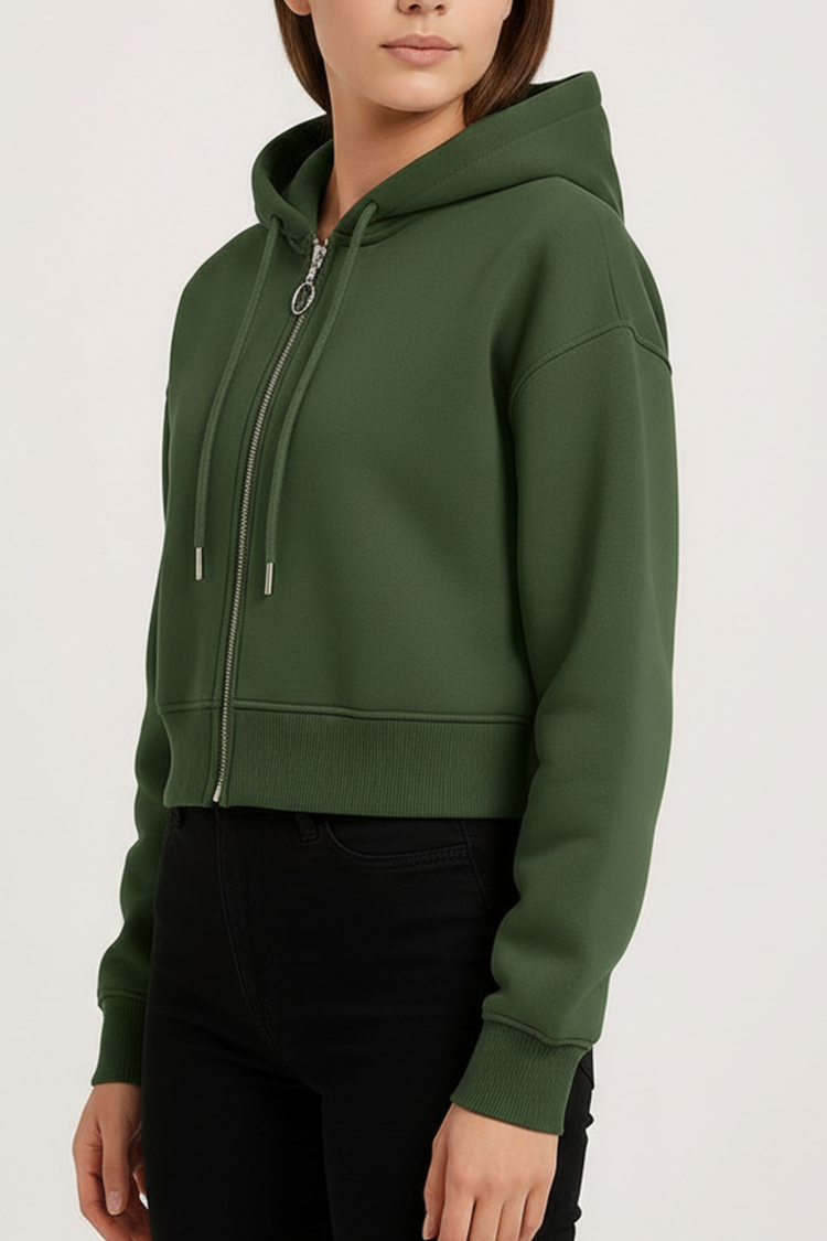 - Modelul are glugă, lungime scurtă și fermoar pe toată lungimea.