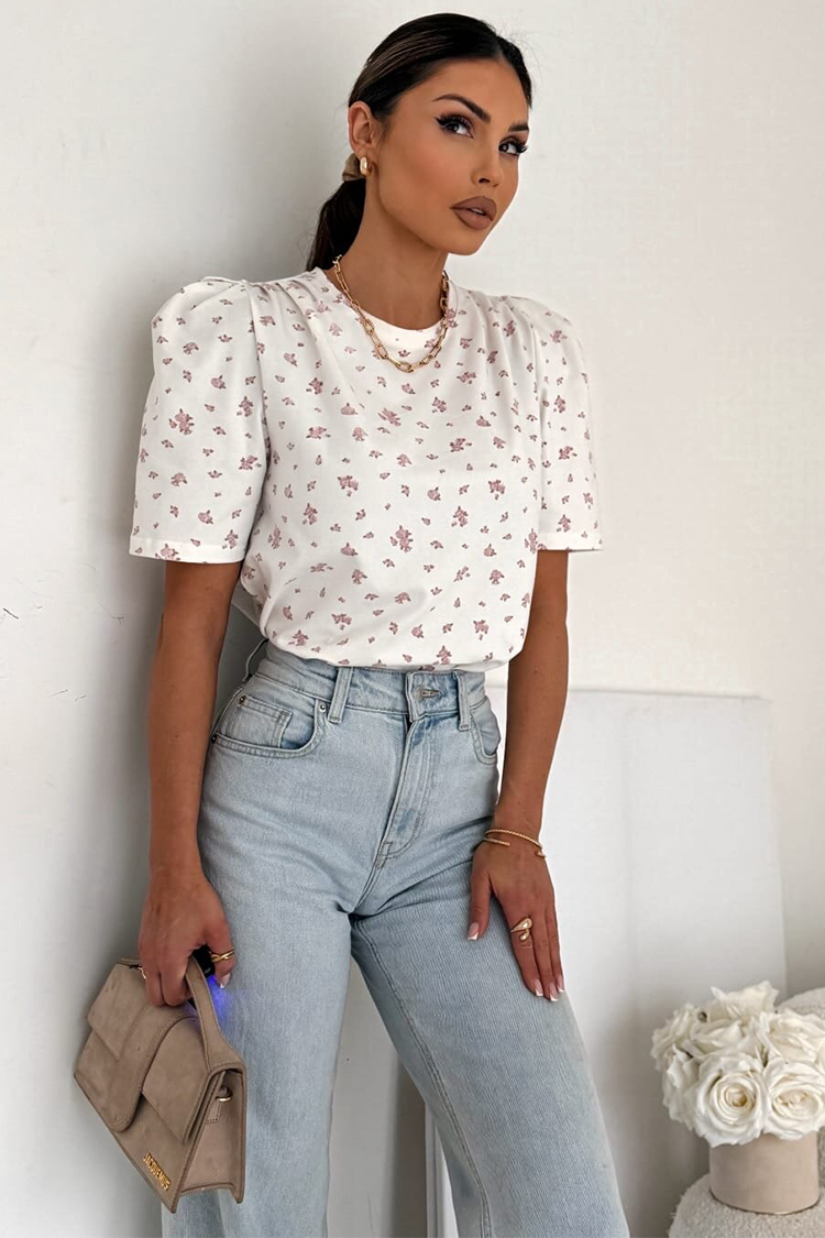 - Modelul are mâneci scurte și îngrijite, decolteu rotund, croială precisă și model floral.