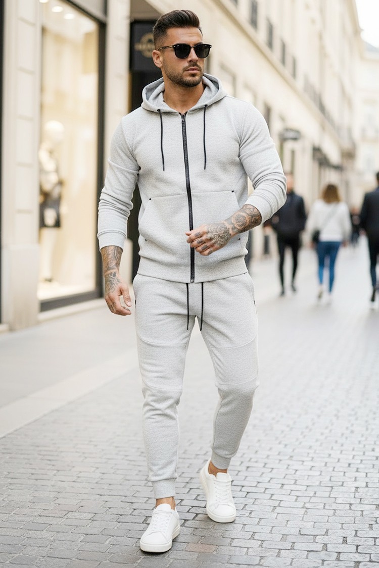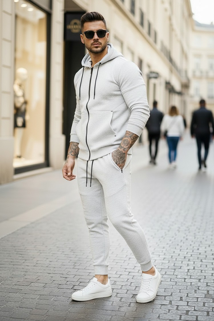 - Set pentru bărbăti confortabil, din două piese, format dintr-un hanorac și pantaloni de culoare gri deschis.