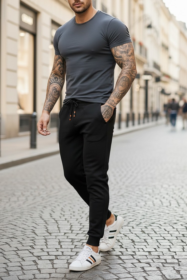 - Pantaloni sport pentru bărbăti cu buzunare și manșete, în mărime maxi, de culoare neagră.