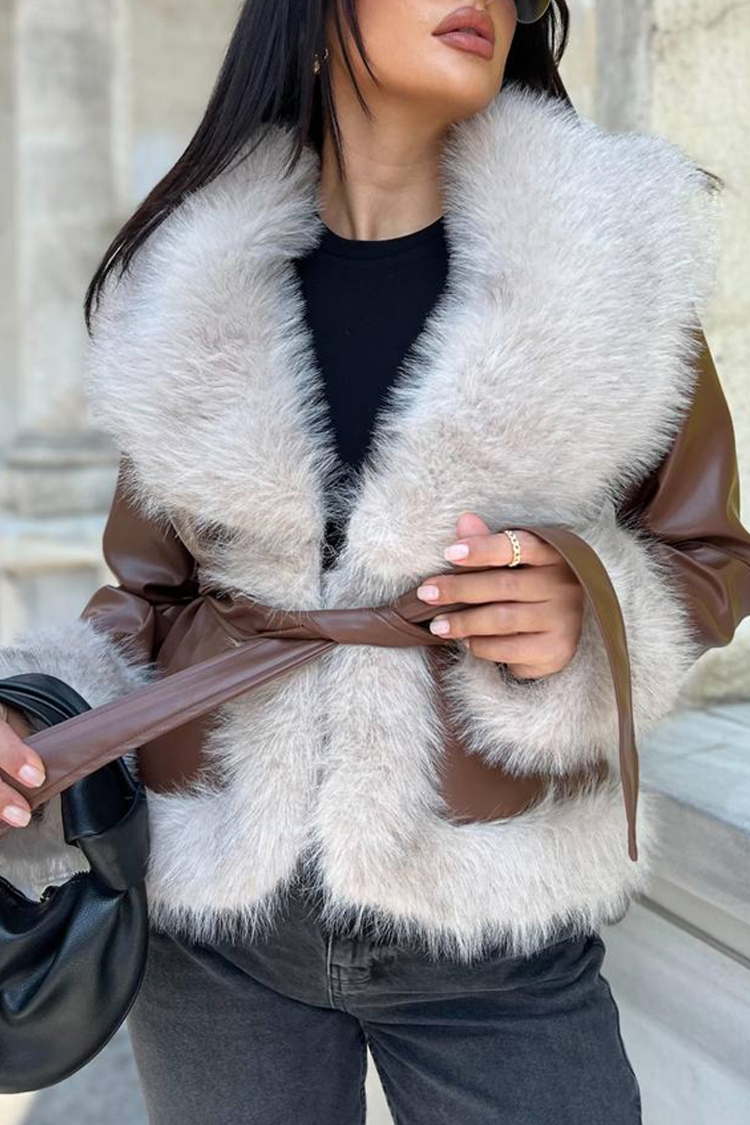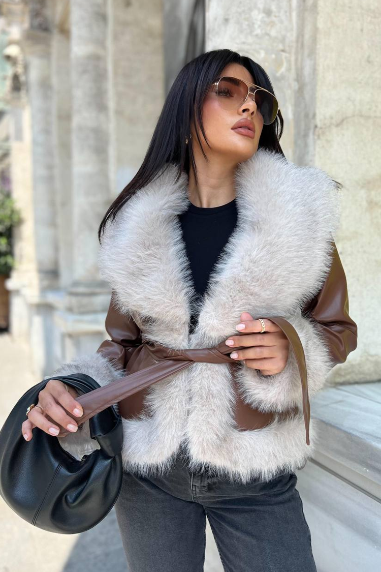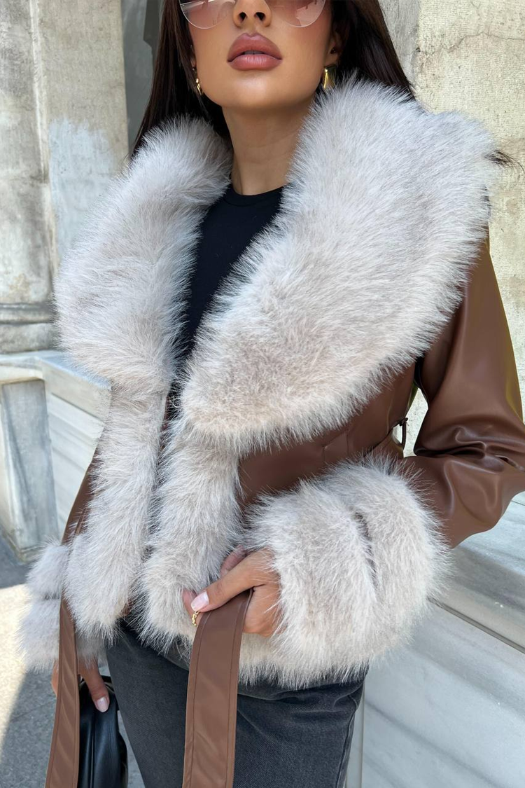 - Modelul este confecționat din piele ecologică, are un guler voluminos cu blană, de culoare maro deschis și o curea din același material.