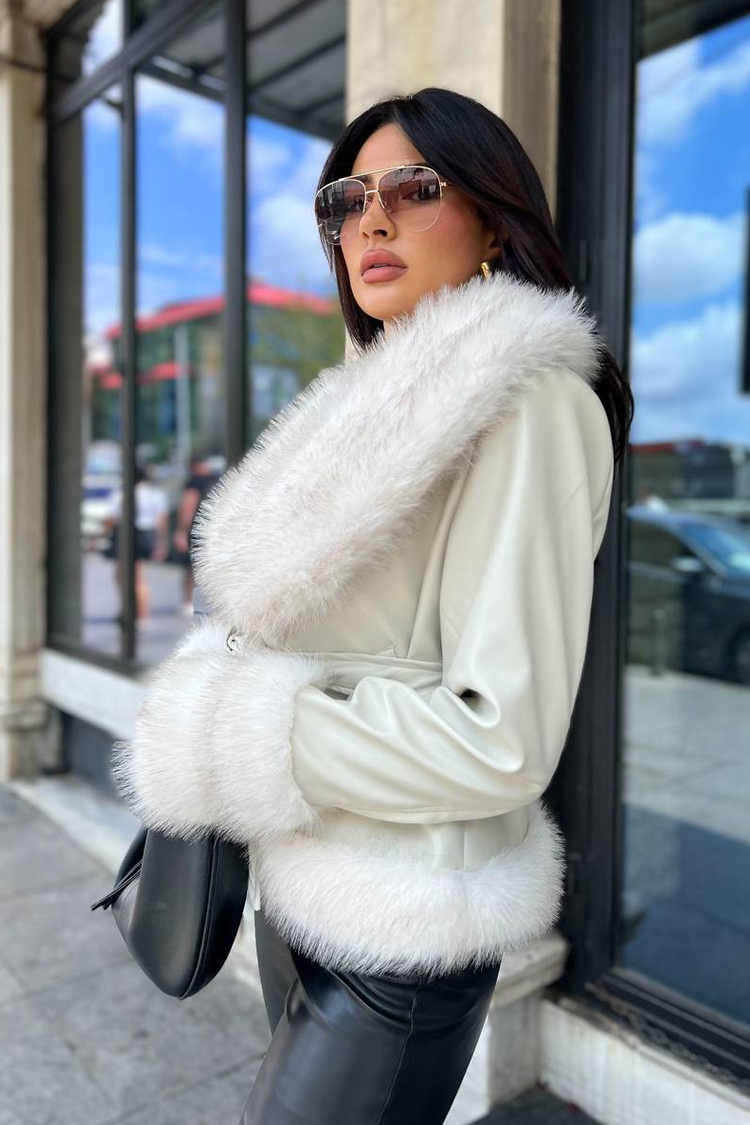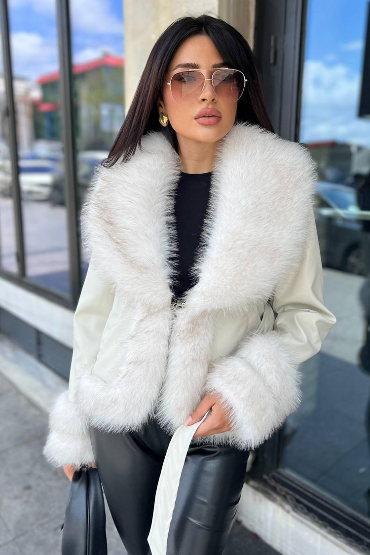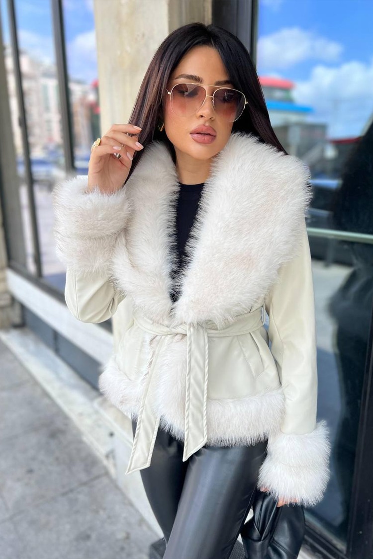 - Modelul este confecționat din piele ecologică, are un guler voluminos cu blană, de culoare ecrus și o curea din același material.
