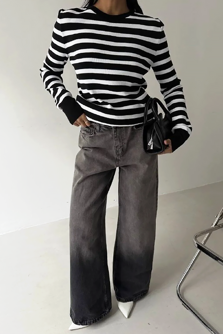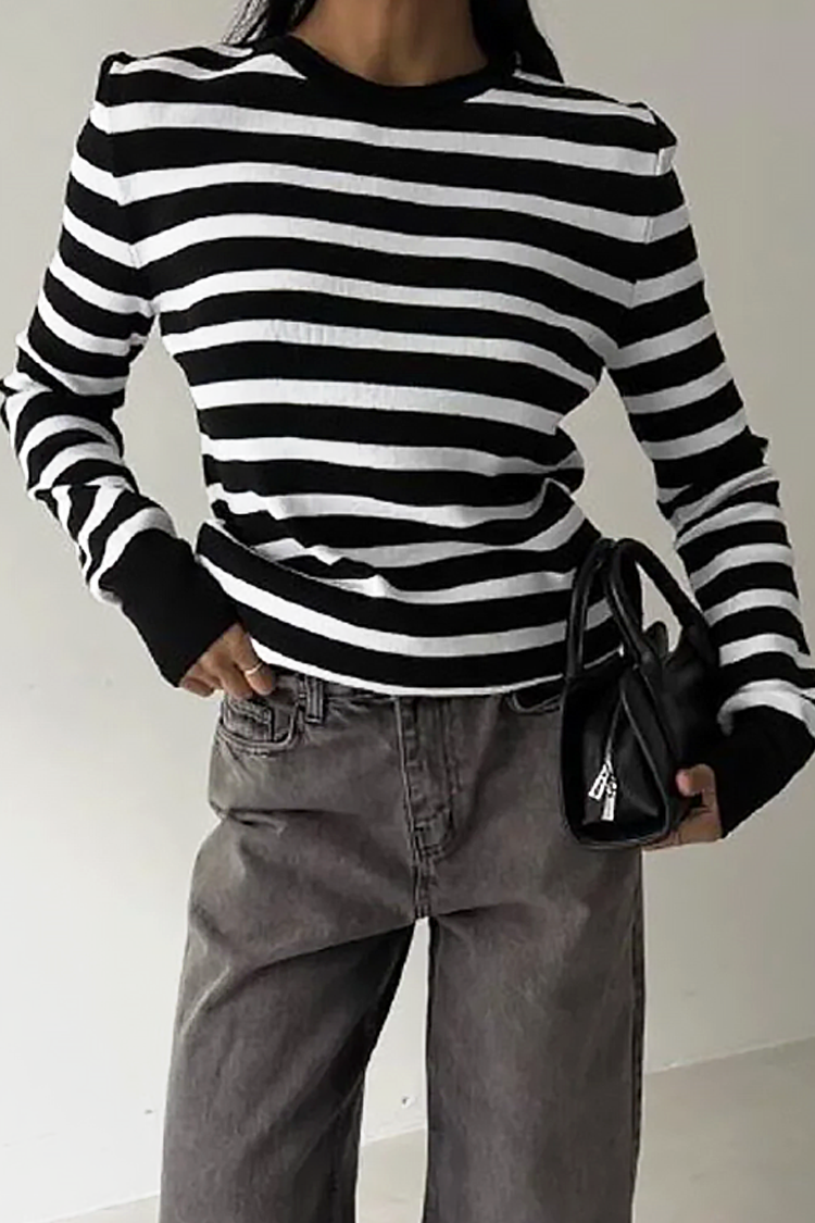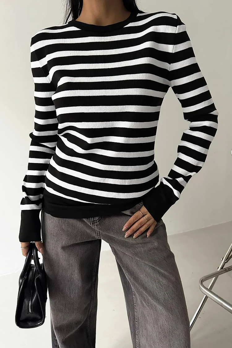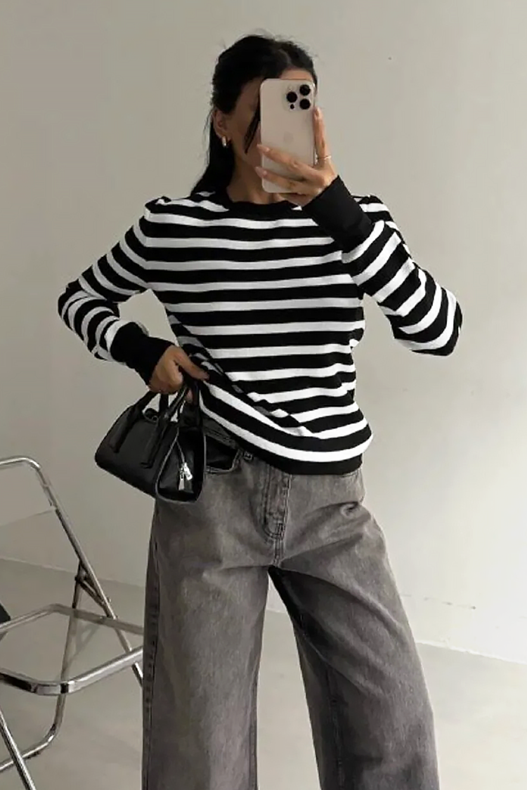 - Modelul are mâneci lungi, o croială clasică și un model în dungi.