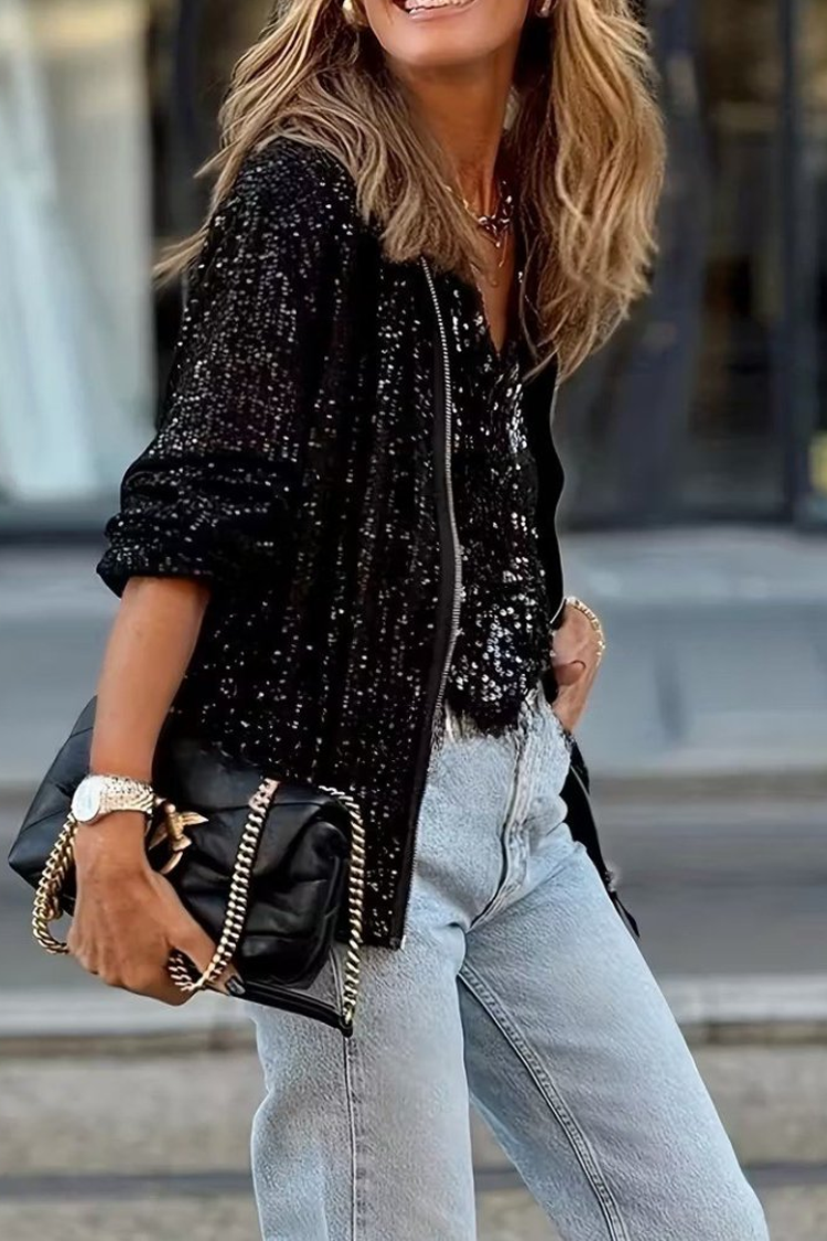 - Modelul are o croială clasică, paiete spectaculoase și se închide cu fermoar în față.