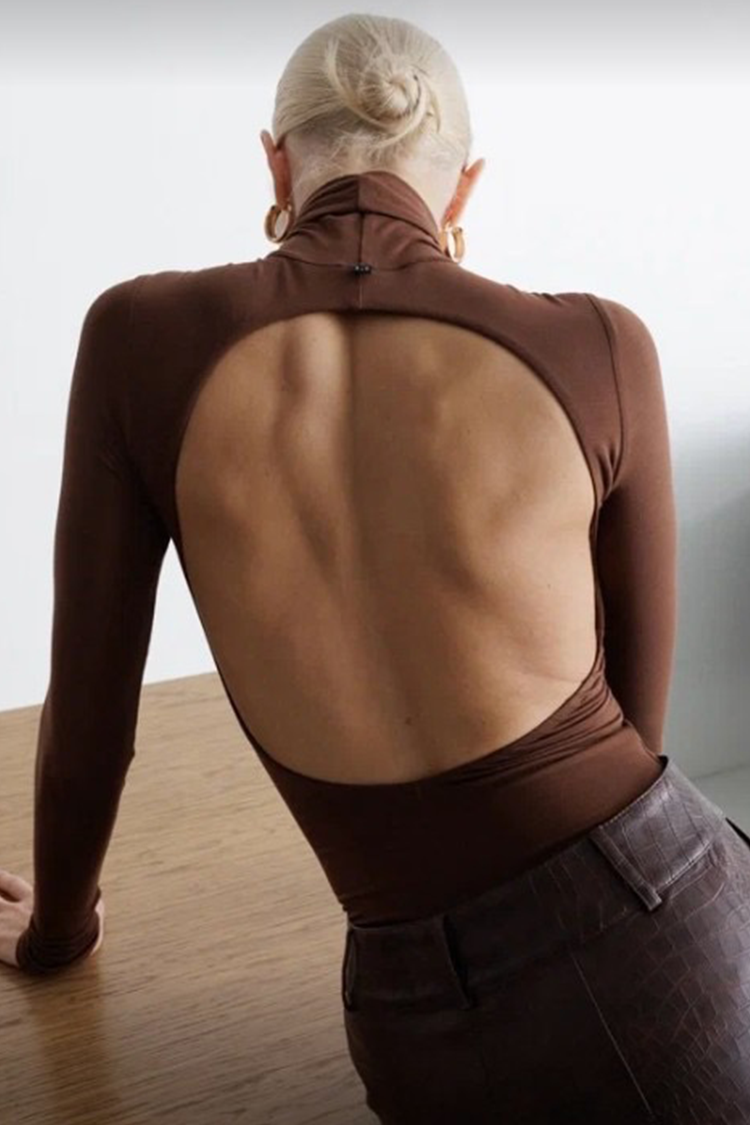 - Modelul are guler înalt și o spate decupată impresionantă.