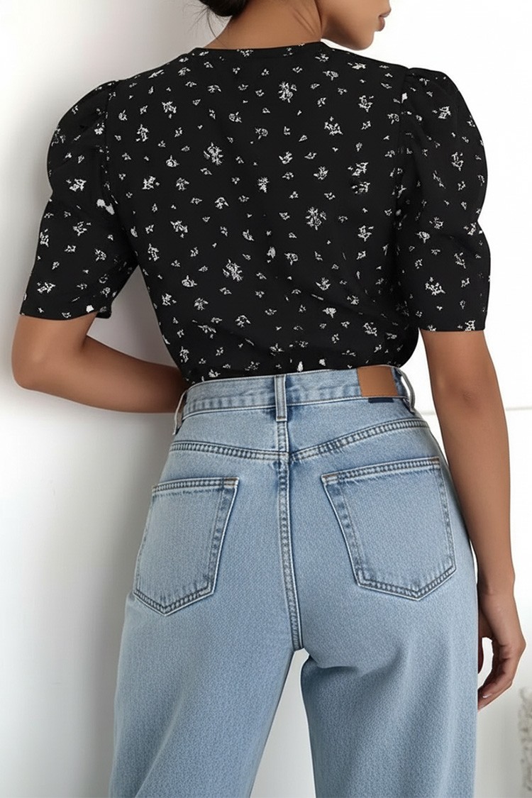 - Modelul are mâneci scurte și îngrijite, decolteu rotund, croială precisă și model floral.