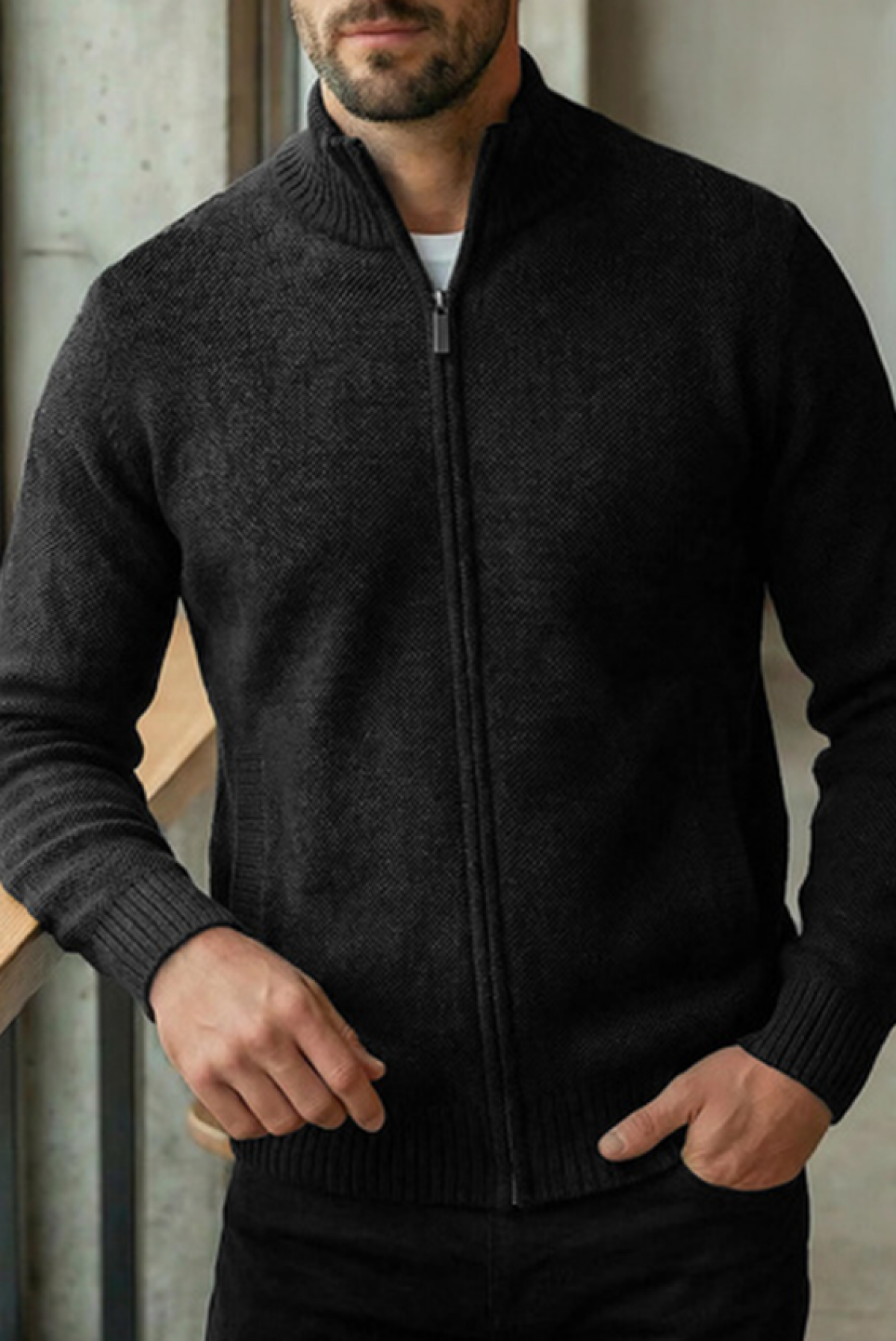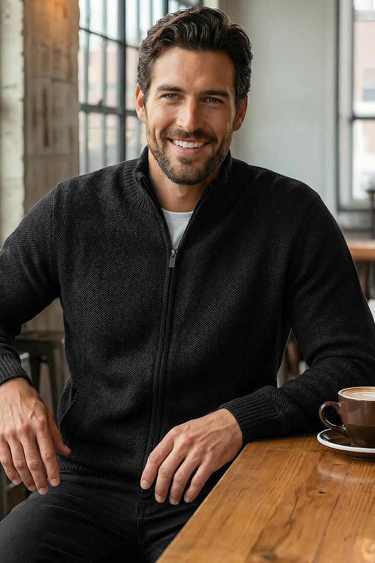- Cardigan clasic pentru bărbați cu guler înalt și buzunare, de culoare neagra, potrivit pentru viața de zi cu zi.