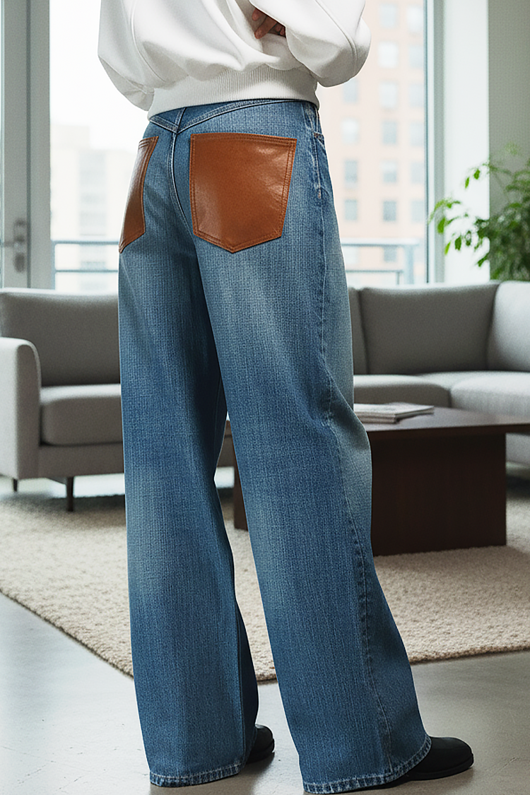 - Modelul are talie înaltă, picioare late și buzunare in spate de culoare maro.