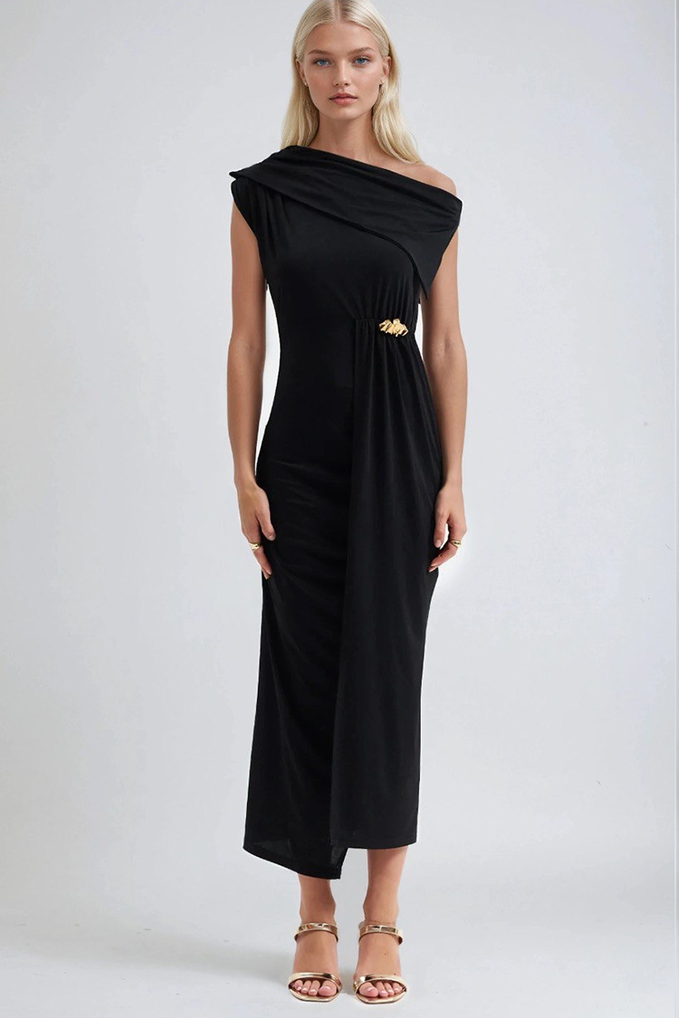 - Modelul are o croială elegantă, detaliu metalic în față, o crăpătură și un decolteu asimetric.