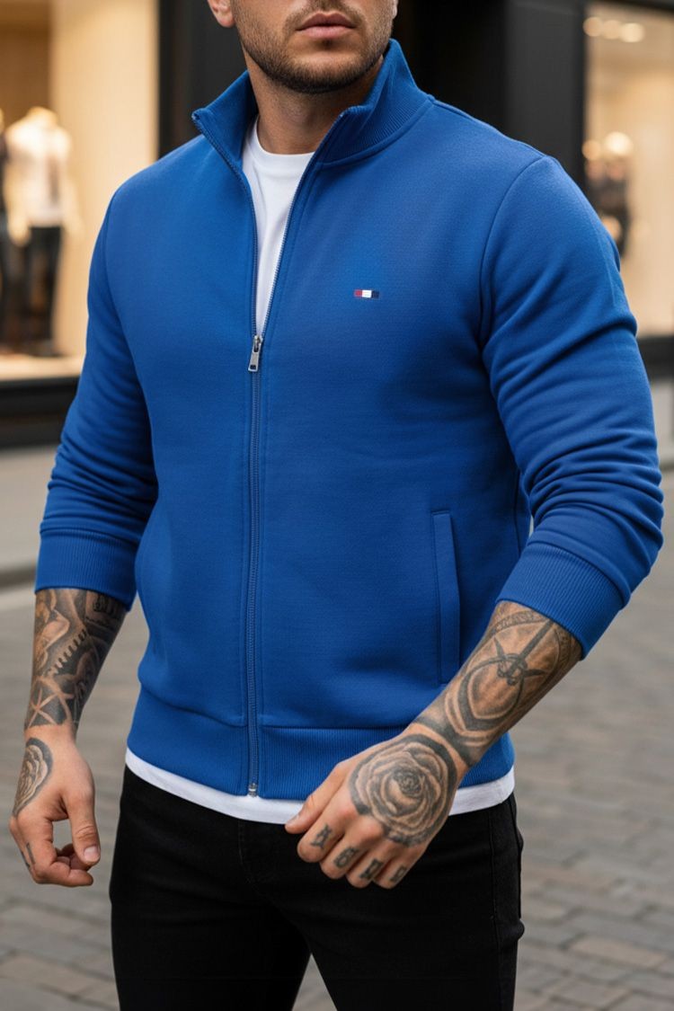 - Hanorac pentru bărbăti practic și confortabil, cu guler înalt, de culoare albastră, potrivit pentru viața de zi cu zi, sport sau plimbări.