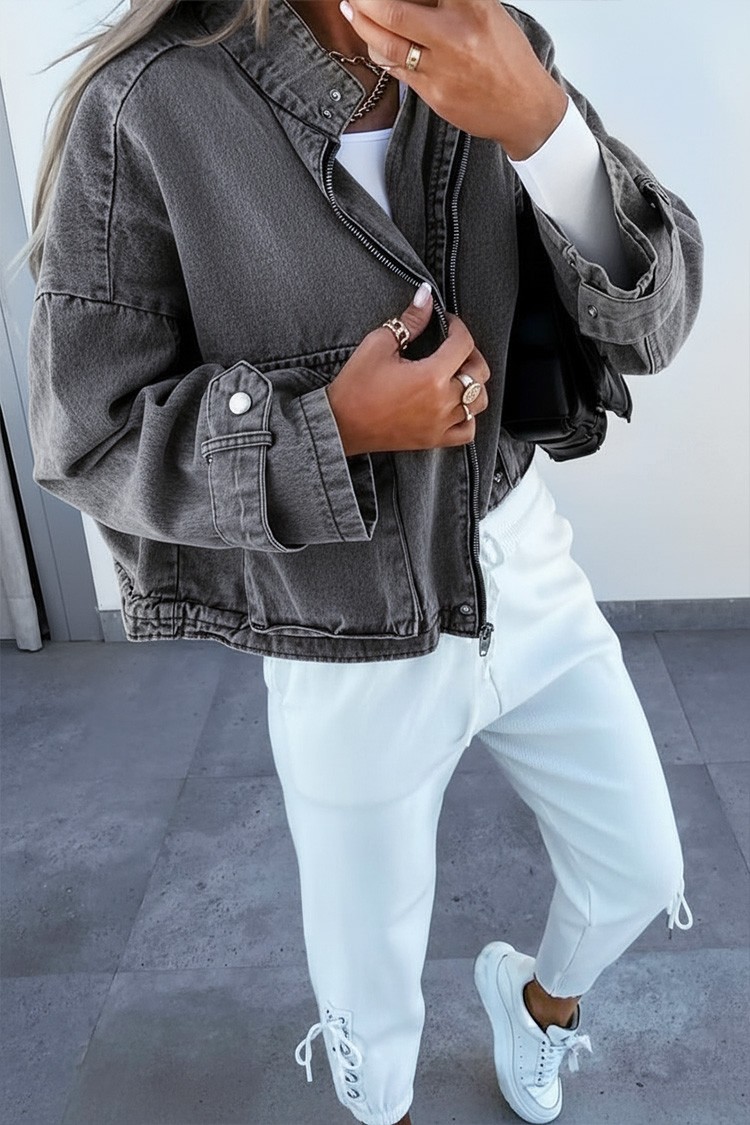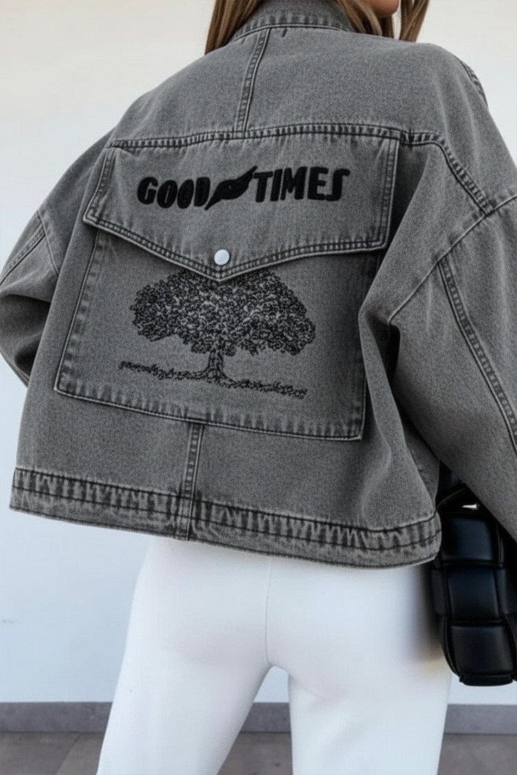 - Pentru un look elegant, alege această geacă din denim, potrivită pentru orice look.