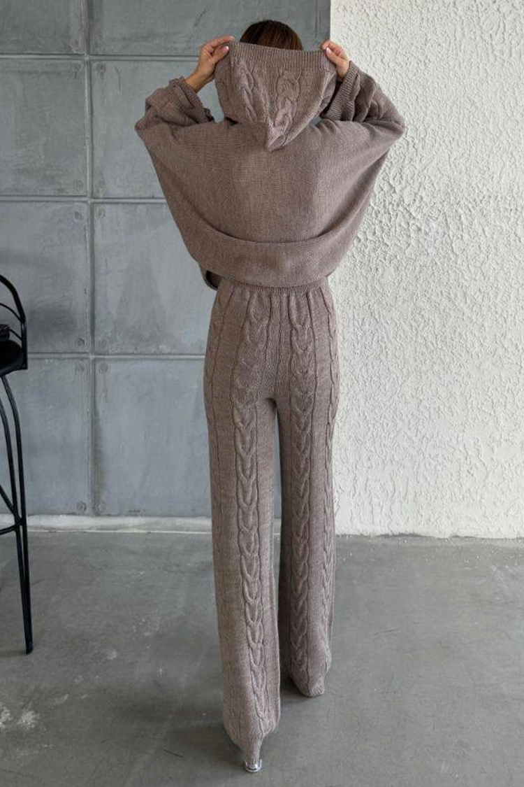 - Hanoracul are o croială lejeră și glugă, iar pantalonii au un design evazat și talie înaltă.