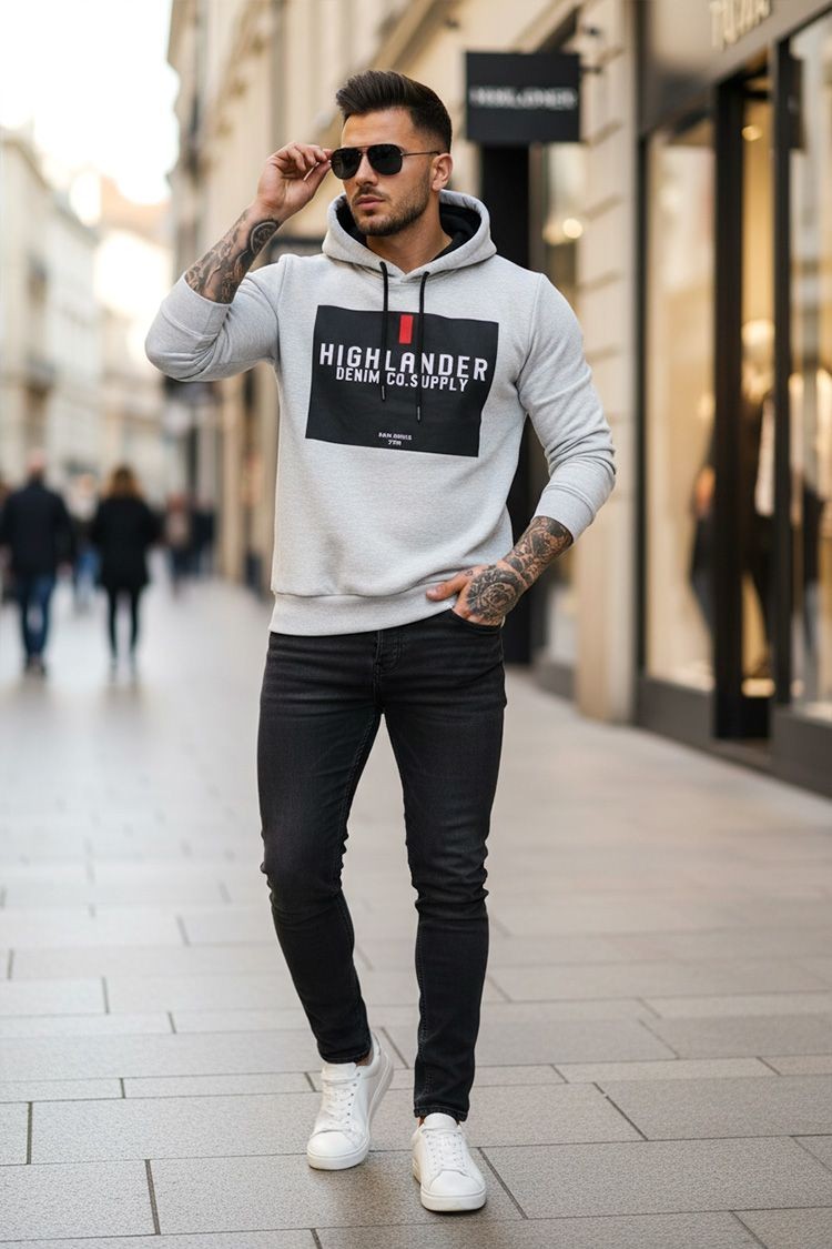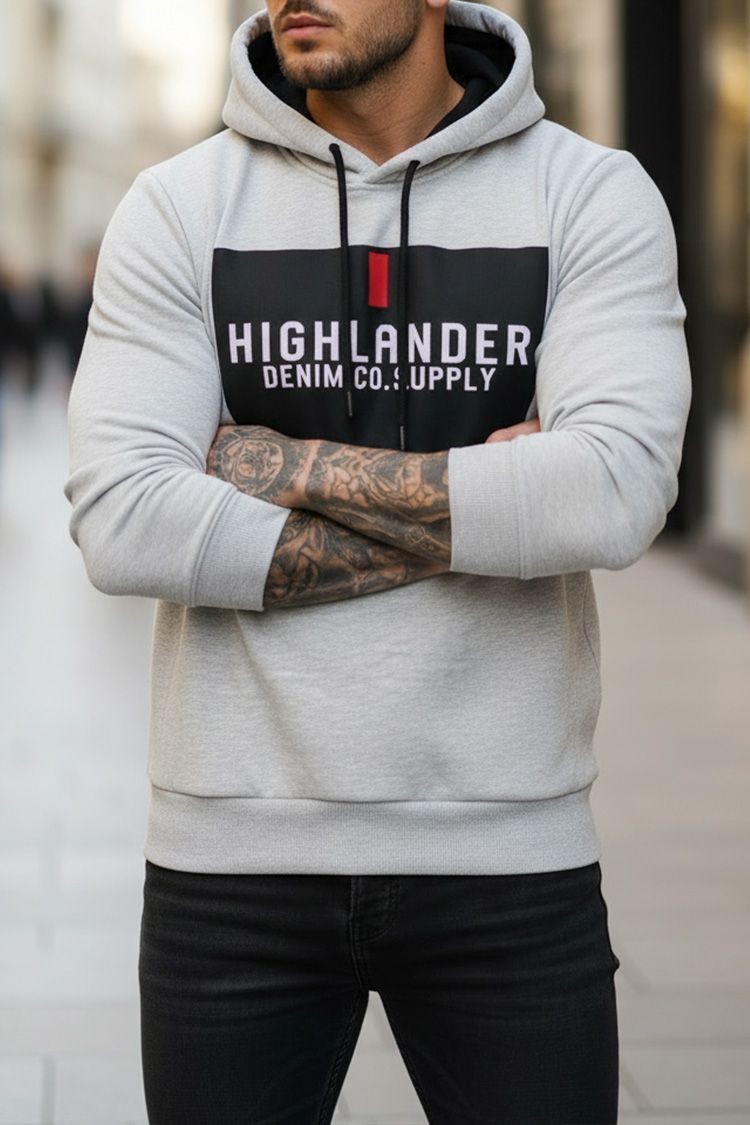 - Hanorac pentru bărbăti practic și confortabil, cu imprimeu de culoare gri, potrivit pentru viața de zi cu zi, sport sau plimbări.