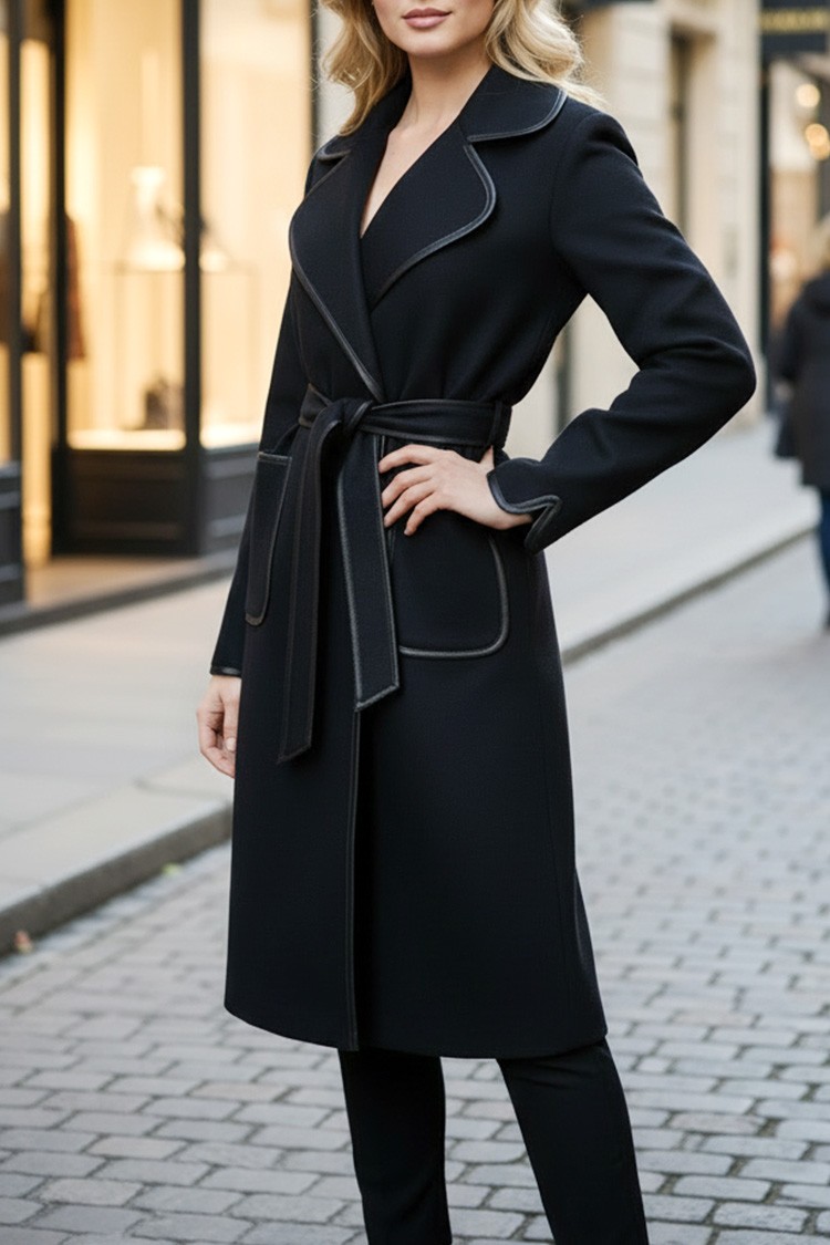 - Modelul monocromatic are guler cu rever și curea.