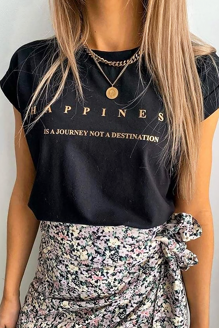 - Modelul are mâneci scurte, decolteu rotund, o croială precisă cu inscripție atractivă.