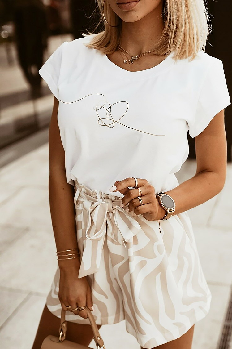 - Modelul are mâneci scurte, decolteu rotund, o croială precisă de o culoare albă.