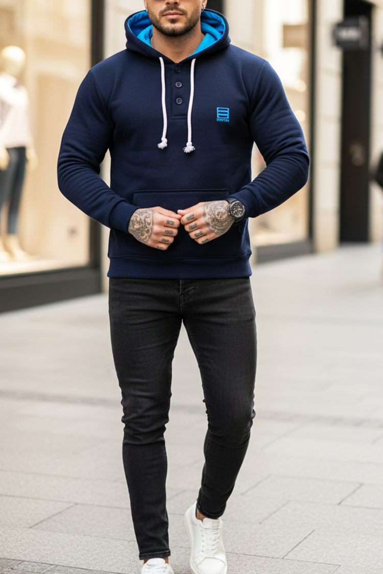 - Hanorac practic pentru bărbăti cu nasturi la decolteu și glugă cu legături, potrivit pentru viața de zi cu zi sau pentru plimbare.