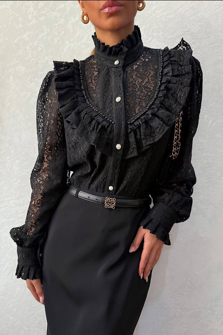 - Modelul are nasturi pe toată lungimea, un design stilat și volane spectaculoase, dantelă și perle decorative.